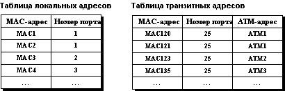 ![]() Рис. 2.5. Взаимодействие узлов локальных сетей через транзитную ATM-сеть Таким образом, коммутатор для принятия решения о передаче кадра оперирует с двумя таблицами - с локальной, которая устанавливает соответствие МАС-адресов его локальной сети локальным портам, и с транзитной, которая содержит для каждого МАС-адреса составной сети АТМ-адрес пограничного коммутатора. Спецификация LAN Emulation не определяет конкретный вид таблиц ATM-LAN конверторов. Один из возможных вариантов этих таблиц приведен на рисунке 2.6.
