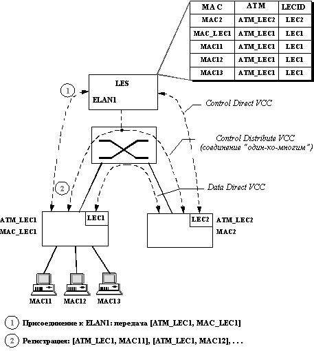 ![]() Рис. 2.6. Таблицы адресов ATM-LAN коммутатора Если АТМ-LAN коммутатор в результате просмотра адресных таблиц видит, что кадр нужно передать через АТМ-сеть другому ATM-LAN коммутатору, то он с помощью стека протоколов АТМ устанавливает виртуальное соединение (Virtual Channel Connection, VCC) с этим коммутатором, а затем передает по нему кадр в форме потока ячеек АТМ. Особенностью инкапсуляции кадров в спецификации LAN Emulation является то, что кадр не упаковывается целиком в ячейку АТМ, а, в виду очень малого размера ее поля данных (48 байт), разбивается на фрагменты, которые затем инкапсулируются в последовательность АТМ-ячеек. Разбиение (сегментация) кадра и последующая его сборка осуществляются стандартными средствами стека АТМ, реализованного в ATM-LAN конверторе. Для передачи трафика локальных сетей через сеть АТМ выбран класс АТМ-сервиса с неопределенной битовой скоростью, что хорошо соответствует алгоритмам работы протоколов локальных сетей, когда конечному узлу не дается никаких гарантий относительно выделяемой ему пропускной способности. Этот класс сервиса реализован в сетях АТМ подуровнем AAL5 (ATM Adaptaton Layer 5), принимающем запросы на установление соединений от протоколов верхних уровней. Остальные классы сервиса сетей АТМ, гарантирующие некоторую часть пропускной способности своим абонентам, в спецификации LAN Emulation версии 1.0 не используются, хотя потребность в них может возникать при работе в локальной сети приложений реального времени. Эти возможности ожидаются в следующих версиях спецификации LAN Emulation. Отдельной задачей является автоматическое построение транзитных адресных таблиц АТМ-LAN коммутатора. Поскольку сети АТМ, как и большинство территориальных сетей, не поддерживают широковещательность, то обнаружить через сеть АТМ пограничные коммутаторы с помощью широковещательных запросов (как это делают, например, клиенты и серверы сетей NetWare) невозможно. Ручное задание АТМ-адресов пограничных коммутаторов может оказаться обременительным занятием для администратора, если таких коммутаторов много и их набор часто претерпевает изменения, что характерно для локальных сетей. Для автоматического построения транзитных адресных таблиц спецификация LAN Emulation предлагает использовать централизованный подход, то есть возложить решение этой задачи на сервер, присоединенный к сети АТМ (рисунок 2.7). Этот сервер носит название LAN Emulation Server - LES. Та часть протокола спецификации LAN Emulation, которая работает в ATM-LAN коммутаторе, называется LAN Emulation Client - LEC. При своей инициализации LEC АТМ-LAN коммутатора сообщает серверу LES свои МАС- и ATM-адреса. Затем LEC регистрирует в LES все МАС-адреса узлов, которые он узнает при изучении своей локальной сети. Таким же образом поступают все пограничные ATM-LAN коммутаторы, поэтому в сервере LES накапливается общая таблица соответствия МАС-адресов узлов локальных сетей АТМ-адресам их пограничных коммутаторов. Для взаимодействия с сервером LES каждый клиент LEC устанавливает прямое виртуальное соединение VCC с этим сервером, называемое Control Direct VCC. Это соединение устанавливается еще на стадии присоединения (Join) клиента LEC к эмулируемой сети. Под эмулируемой сетью понимается вся совокупность локальных сетей, взаимодействующих друг с другом через данный сервер LES и пограничные коммутаторы таким образом, как будто они работают в локальной с