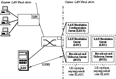 ![]() Рис. 2.9. Компоненты LANE и их взаимосвязи На основании полученной информации LEC должен выбрать эмулируемую сеть, к которой он желает присоединиться и известить об этом LECS. Затем LEC выполняет процедуру присоединения к LES выбранной эмулируемой сети, регистрирует там МАС-адреса своих узлов и начинает работать с составной сетью. Протокол взаимодействия клиентской части протокола LAN Emulation, а именно LEC, с серверными частями этой спецификации LECS, LES и BUS называется LAN Emulation User-Network Interface (LUNI). Если ATM-LAN коммутатор поддерживает со стороны локальной сети несколько виртуальных сетей, то он может отождествить каждую виртуальную сеть с эмулируемой сетью. Поэтому при регистрации МАС-адресов на сервере LES определенной эмулируемой сети коммутатор регистрирует только те МАС-адреса, которые относятся к виртуальной сети, отождествляемой с этой эмулируемой сетью. Если все пограничные коммутаторы поддерживают несколько виртуальных сетей, и администратор хочет, чтобы эти сети работали в масштабах всей составной сети, то отождествление их с определенными эмулируемыми сетями дает хороший способ передачи информации о принадлежности МАС-адреса той или иной сети между разными пограничными коммутаторами. Спецификация LAN Emulation не определяет способа построения виртуальных сетей пограничными коммутаторами на стороне локальной сети. Эта спецификация дает только стандартный способ информирования других коммутаторов о том, какой виртуальной сети принадлежит передаваемый кадр. В составной сети кадры разных виртуальных локальных сетей передаются по разным виртуальным соединениям и поэтому не смешиваются. Взаимодействие между разными эмулируемыми сетями в спецификации LAN Emulation не предусматривается. Для организации взаимодействия нужен маршрутизатор, который либо присоединяется к интерфейсам локальных сетей, либо подключается непосредственно к сети АТМ и, поддерживая спецификацию LAN Emulation, присоединяется к каждой из эмулируемых сетей. Маршрутизатор назначает эмулируемым сетям сетевые адреса и производит на основании этих адресов передачу пакетов между сетями. Организация взаимодействия всех узлов составной сетиПонятно, что узлы, непосредственно присоединенные к АТМ-коммутаторам с помощью АТМ-адаптеров, могут взаимодействовать между собой и без привлечения добавочных протоколов, таких как протоколы спецификации LAN Emulation. Но в таком случае приложения и протоколы прикладного уровня (NCP, SMB, NFS или FTP) должны быть модифицированы, так как они должны научиться поддерживать интерфейс со стеком протоколов АТМ на своем узле, а также не использовать отсутствующие в протоколах АТМ широковещательные рассылки. Кроме того, АТМ-узлы не смогут взаимодействовать с узлами локальных сетей, на которых установлены традиционные стеки протоколов с канальными протоколами Ethernet, Token Ring и т.п. Спецификация LAN Emulation позволяет превратить АТМ-узлы в узлы, подобные традиционным узлам локальных сетей. Это достигается за счет размещения в АТМ-узле программного обеспечения клиента LEC, выполняющего те же функции, что и LEC пограничных ATM-LAN коммутаторов. На АТМ-узле LEC размещается между АТМ-протоколами драйвера сетевого адаптера АТМ и протоколом LLC (рисунок 2.10) или любым другим протоколом, который рассчитан на работу с протоколом МАС-уровня локальной сети. Протокол LEC предоставл