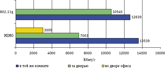 Говоря о MIMO в общем, следует отметить, что для адаптера это означает лишь использование нескольких каналов, если это предлагает сделать роутер, так что никаких настроек для оптимизации сети производить для клиентских устройств не нужно. Все настройки происходят на роутере. МетодологияТесты происходили в стандартном офисном помещении. Первая часть тестирования сводилась к тому, чтобы продемонстрировать простой прирост скорости в тех же офисных условиях, в которых работало стандартное окружение 802.11g. Так, роутер располагался в серверной комнате, а клиентские устройства за железо-бетонной перегородкой. Вообще говоря, для передачи одиночного потока данных мы не заметили почти никакой разницы между стандартным режимом 802.11g, и SuperG D-Link или RangeMax NetGear. Дело в том, что обычно в случае передачи одного потока данных от роутера к клиентскому устройству, пропускная способность лимитируется самими компьютерами. При подключении еще одного потока передачи данных, который передавался в том же сетевом окружении параллельно (другое устройство также скачивало с сервера файл), разница куда более заметна. Ну а третий случай, когда помимо двух потоков данных в сети был организован обмен двух компьютеров небольшими пакетами (копирование большого массива текстовых файлов), показал еще более разительное преимущество MIMO в процентном соотношении. Для оценки пропускной способности использовалась несложная утилита SpeedTest, которую можно свободно скачать в Интернете. Следует оговориться, что эта утилита оценивает время передачи тестового файла, которое, вследствие известных задержек в протоколе IP и стандартной ОС Windows, конечно, оказывается несколько ниже, но ведь нас интересует реальная способность сетей по передаче файлов, а не нулей и единиц. Впрочем, при передаче очень больших файлов, стандарт 802.11g показал на SpeedTest стандартные для него 20 Мбит/с, потому что погрешности, связанные с началом отсчета и окончанием были не столь велики на фоне 1 Гбайт. Однако нам не каждый раз приходится передавать такие файлы, и поэтому задержки в действительности играют большую роль, что и отражает наше тестирование. Поэтому в качестве тестового файла для передачи данных был выбран мультфильм, сжатый кодеком DivX до 50 Мбайт. Также следует отметить, что полученный выигрыш при наличии двух потоков данных, следует умножить на два, так как второй поток данных, естественно, тоже становился быстрее при использовании MIMO. Скорость: MIMO vs 802.11g Как вы можете видеть, применение MIMO значительно увеличивает пропускную способность сети, причем это наблюдается, даже если в сетевом окружении используются адаптеры 802.11g, собственно говоря, для двух потоков данных, каждый из них преимущественно работал именно в режиме 802.11g, но зато на максимальной скорости. И чем больше в беспроводной сети устройств, тем больше наблюдается скоростных преимуществ от использования MIMO. Дальность работыПоднимая вопрос об увеличении дальности работы сети, не станем отрицать ее наличие, но замерять ее достаточно точно не представляется возможным, так как офисное окружение может быть различным. Тем не менее, по субъективным данным, она возрастает в 1,5–2 раза. При этом наличие сложно проходимых объектов на пути сети создает некоторые проблемы со скоростью, которые, как мы обнаружили, для роутеров MIMO оказались бо