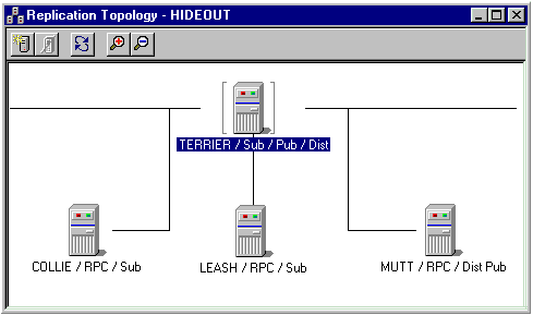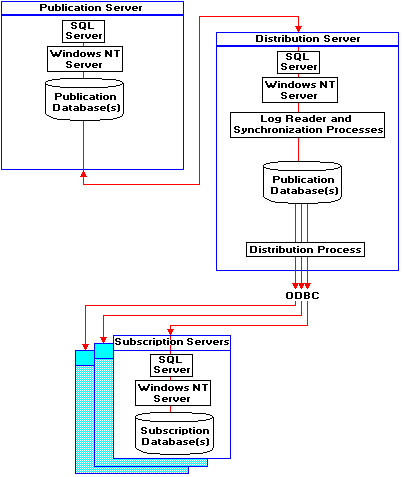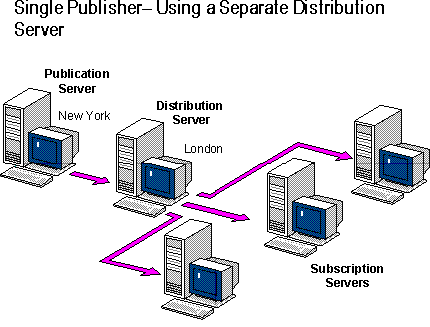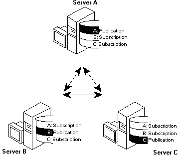 При такой схеме репликации данные передаются всегда в одном направлении от издателя через дистрибутора к подписчику. Это не означает, что в данные на серверах-подписчиках нельзя вносить изменения, это означает лишь, что в случае модификации данных в исходной и реплицированной базе данных разрешение конфликтов всегда происходит в пользу издателя. Любой SQL Server может выступать в любой из трех ролей (рисунок 16). Гибкие условия репликации SQL Server предоставляет несколько интересных возможностей, позволяющих гибко управлять процессом распространения данных: