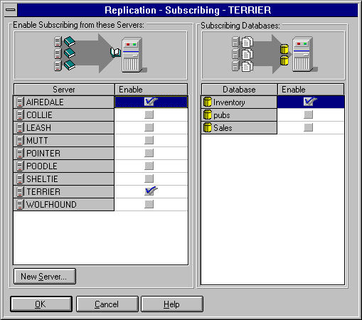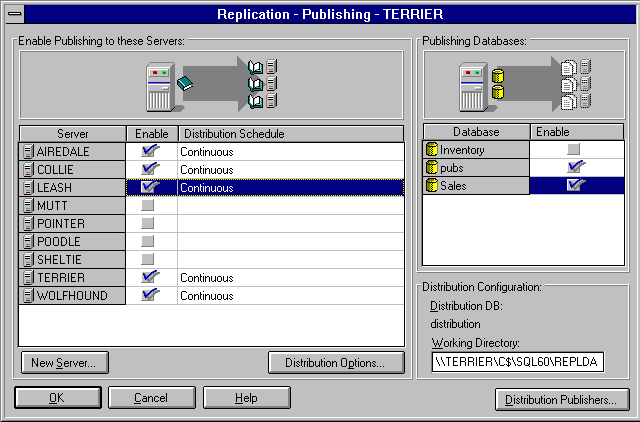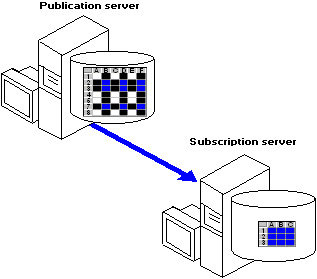 Рис. 18. Компоненты процесса репликации Если на таблице, данные которой должны реплицироваться, определены правила проверки ссылочной целостности, - существует возможность отмены их выполнения на период репликации, что позволяет избежать ошибок при загрузке данных в базу подписчика. Средства администрирования Управление всем процессом репликации выполняется из SQL Enterprise Manager. На рисунке 19 приведен пример создания защищенной публикации, на рисунке 20 - пример избирательной подписки на публикаций. Административная консоль имеет специальное окно, называемое Replication Topology (топология репликации), в котором графически изображается схема репликации, в которой данный сервер является издателем, со всеми подписчиками. На рисунке 21 приведен внешний вид окна топологии репликации. Добавление новых подписчиков возможно методом "перетащи и оставь".