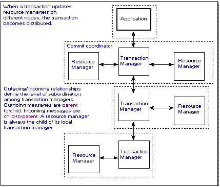 Если программа для выполнения последовательности действий обращается только к одному серверу, функции DTC сводятся к передаче запросов программы SQL серверу, который обеспечивает выполнение транзакции собственными средствами, и результатов - прикладной программе. В случае, когда в процессе исполнения программы ей требуется доступ к удаленным источникам данных, схема взаимодействия усложняется, возникает необходимость координации выполнения запросов и применения механизма двухфазной фиксации транзакций. Рассмотрим рисунок 22.