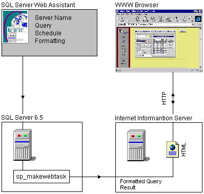 Рис. 22. Схема взаимодействия в распределенной транзакции Для выполнения согласованной фиксации или отката транзакции необходимо наличие координатора. Координатор порождает объект, представляющий распределённую транзакцию, и следит за согласованным выполнением операций ведомыми менеджерами транзакций и сохраняет статус текущей транзакции до момента её завершения. В SQL Server распределенная транзакция может быть инициирована явно, командой BEGIN DISTRIBUTED TRANSACTION, либо неявно, в момент вызова удаленной хранимой процедуры. В процессе исполнения прикладная задача может конкретно указать имя компьютера, DTC которого будет выполнять роль координатора. Если имя координатора не задано, то берется имя из реестра локальной станции, задаваемое в процессе настройки клиентской рабочей станции. Программа настройки входит в комплект клиентской части SQL Server и регистрирует себя в контрольной панели. Если и здесь имя не задано, в роли координатора выступает DTC сервера, к которому прикладная программа обратилась. Если распределённая транзакция инициируется неявно, методом вызова удаленной хранимой процедуры, координатором всегда становится локальный DTC. Кроме MS DTC для выполнения операций над распределенными данными может использоваться любой монитор, совместимый со стандартом TP-XA, к примеру TUXEDO, ECINA или TOPEND. Настройки SQL Server для использования с мониторами транзакций третьих фирм не входят в программу курса и далее не рассматриваются. За более подробной информацией следует обращаться к руководству по SQL Server, технической библиотеке Tech-Net и документации по конкретному XA-совместимому монитору. Настройка серверной компоненты DTC выполняется в SQL Enterprise Manager. Администратор может установить уровень отладочных сообщений в журнале регистрации распределенных транзакций, разрешить или запретить трассировку, просмотреть историю исполнения транзакций, просмотреть список незавершенных транзакций, их текущее состояние и принять решение о принудительной фиксации или откате. 2.11. Средства интеграции с Internet, SQL Web AssistantВ состав SQL Server 6.5 входит графическая утилита, называемая SQL Web Assistant, позволяющая на основании данных сервера генерировать файлы в формате HTML 3.0, известные также как Web-страницы, которые могут быть просмотрены любым Internet-браузером. HTML-файлы могут быть переданы серверу Internet для организации доступа к ним внутри организации или для всеобщего обозрения в World Wide Web. Web Assistant использует для работы как операторы Transact-SQL, так и набор системных и расширенных хранимых процедур. Вследствие использования "родного" метода доступа данный способ генерации WWW-страниц имеет лучшие показатели быстродействия и масштабируемости, по сравнению, например, с методом, используемым в Common Gateway Interface. Однако область применения этого способа ограничена в основном неинтерактивными запросами к базе данных. Типовая схема применения Web Assistant приведена на рисунке 23.