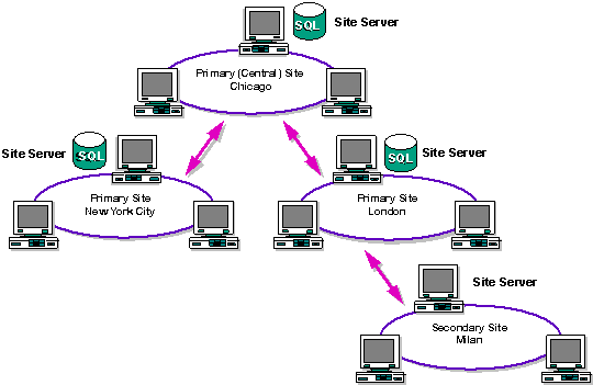сервер; каждая головная площадка должна иметь в составе SQL Server 6.0 или старше для хранения информации о конфигурации данной площадки и всех находящихся ниже её в иерархии организации. SQL-сервер может исполняться как на site-сервере, так и на выделенной машине. Если площадки расположены в единой достаточно производительной сети и используют разные имена баз для хранения информации, они могут обращаться к одному SQL-серверу.