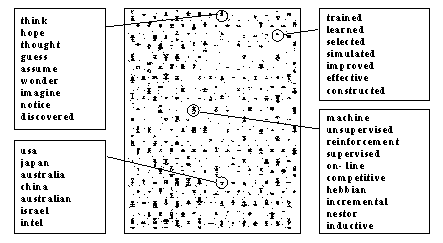 целом, придумать что-либо проще, с точки зрения пользовательского интерфейса, трудно. ![]() Рис. 2 Пример семантической самоорганизующейся карты, построенной при экспериментах группы Кохонена с группой новостей comp.ai.nueral-nets. В узлах карты очень мелким шрифтом написаны, слова попавшие в узлы. В выносках приведено содержимое ряда удачных узлов.