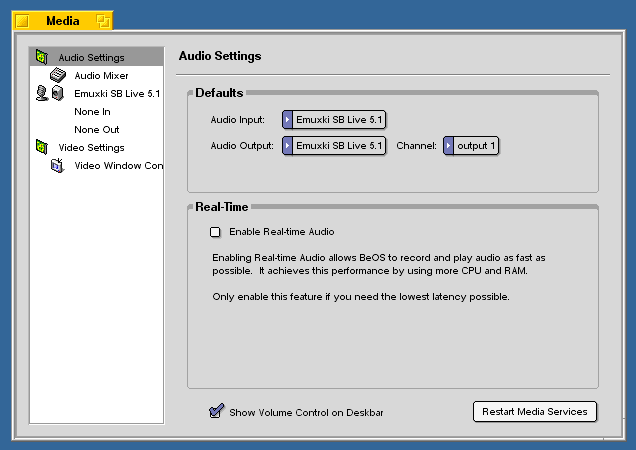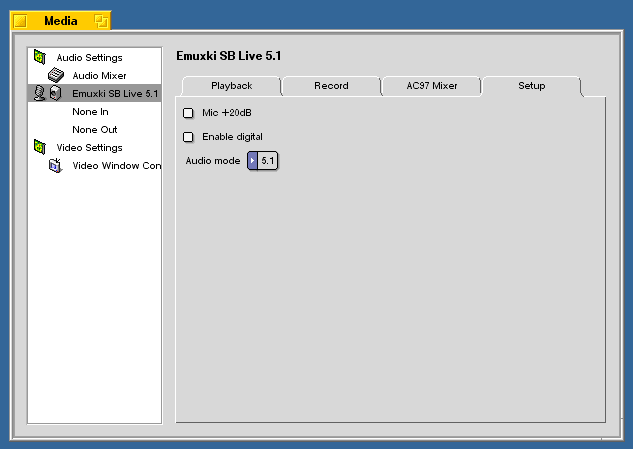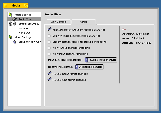 2004 г. Многоканальный звук в BeOS или как установить и настроить драйвера к аудио-картам CreativeПроблема:В BeOS R5 и старше есть стандартный драйвер для аудио-карт на базе чипов серии emu10k (Creative SB Live!, Audigy, Audigy2), но его главный недостаток в том, что он работает только в режиме стерео (2.0). Кроме того, он поддерживает не все звуковые карты серий Audigy и Audigy2. Решение:Проблему можно решить, установив в BeOS драйвера и некоторые части media-подсистемы (Media Kit) OpenBeOS. В частности, это драйвер emuxki для аудиокарт на базе emu10k1, emu10k2 и набор из двух media_addon'ов: mixer.media_addon и multi_audio.media_addon. Кое-что из этого можно найти на BeBits.com, но это довольно старые версии и там нет mixer.media_addon'а. В качестве альтернативы скачиванию и компиляции исходников с CVS OpenBeOS.org я предлагаю свой билд от 1 января 2004 года (работает как в R5, так и в R5.1d0 Exp/Dano): http://ccfit.nsu.ru/~panasyuk/files/obos_emuxki_media_addons-1-1-2004.zip Из комментариев пользователей и разработчиков на BeBits.com: 1. Audigy LS работать в BeOS не будет, так как часть её функциональности эмулируется программно. 2. У первых Audigy был аппаратный дефект (шумы), который был исправлен программным путём - Creative выпустила патч для драйверов Windows. Под BeOS эта проблема всё ещё остаётся. Установка:1. Скопируйте emuxki в /boot/home/config/add-ons/kernel/drivers/bin и сделайте ссылку на него в /boot/home/config/add-ons/kernel/drivers/dev/audio/multi 2. Скопируйте все media_addon'ы в /boot/home/config/add-ons/media 3. Запустите панель настроек Media из меню Be|Preferences|Media и в Audio (или Video) Settings нажмите кнопку 'Restart Media Services'. Удалять аналогичные системные media_addon'ы и драйвера не обязательно. Вот где проявляются некоторые отличительные черты BeOS - после установки новых драйверов моя звуковая карта была тут же определена, без перезагрузки компьютера. После установки media_addon'ов я перезапустил media-подсистему и услышал звук в колонках (поганого качества, правда, но это уже вина установок драйвера по-умолчанию). Настройка:Далее я расскажу, как настроить драйвера и приведу настройки аудио-микшера для оптимального качества звука (искажения и шумы по-минимуму, нормальный баланс каналов) на примере Creative SB Live! 5.1 Digital [SB0220]. Изначально звук настроен так, что он хрипит и слишком завышены басы. Запустите панель настроек Media (меню Be|Preferences|Media). В разделе Audio Settings выберите Emuxki (Emuxki SB Live 5.1 в моём случае) в качестве основной звуковой карты. Рис. 1. Audio Settings Перейдите во вкладку Setup настроек Audio Mixer'а и установите все опции, как показано на скриншоте. Опцию 'Use non linear gain sliders (like BeOS R5)' лучше отключить, тогда значение всех полозков будет изменяться линейно (поверьте мне, работать с такими полозками гораздо удобнее). С помощью опций 'Allow output channel remapping' и 'Allow input channel remapping' можно получить доступ к очень тонкой настройке выходных и входных каналов (такого в явном виде нет даже в драйверах под Windows). Советую ничего не менять, если вы не уверены в том, что делаете. Рис. 2. Audio Mixer Setup Перейдите во вкладку Gain Controls настроек Audio Mixer'а и установите уровень громкости выходного сигнала примерно так же, как на скриншоте, можно чуть ниже. Рис. 3. Audio Mixer Gain Controls Переходим непосредственно к настройке драйвера (Emuxki SB Live 5.1). Зайдите во вкладку Setup и выберите необходимый audio mode. Для DVD это, очевидно, 5.1. А вот у проигрывания стерео-композиций есть свои особенности. В Windows, даже если в системе выставлен режим аудио 5.1, все стерео-композиции проигрываются как квадра (4.0, Front + Rear). В BeOS же они микшируются на все 6 каналов и звучат, соответственно, по-другому (как прав
