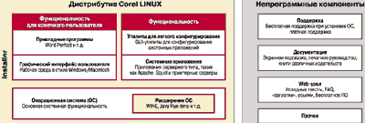 Кстати, Corel - наверное, единственная из компаний-производителей дистрибутивов Linux, имеющих четкий план действий, не просто впихивает различные утилиты под одну "крышу", но и выстраивает определенную структуру продаваемого ПО (см. схему). При этом пользователь получает расширения к ОС, включая виртуальную машину Java и среду WINE, электронную документацию, техническую поддержку, исходные тексты, "заплатки" и т. д. Это уже мини-индустрия. Установка Corel LINUXПожалуй, Corel LINUX - единственный коммерческий вариант Linux (кстати, и UNIX), установка которого проходит действительно безболезненно. Графическая среда Corel LINUX Installer понятна безо всякой документации. Достаточно просто выбрать диск и программное обеспечение, которое вы планируете инсталлировать вместе с операционной системой. Вот уж где действительно работает Plug & Play! За все время установки я так и не узнал, что же у меня находится внутри моего "числодробителя". В то время как, конфигурируя Windows 98, я изучил все прерывания и каналы DMA вместе с портами, чтобы убрать конфликты между звуковой и сетевой платами и какой-то системной дребеденью. Разумеется, если ваш компьютер - нечто из ряда вон выходящее, можно подправить конфигурацию и вручную (при наличии драйверов). Начало установки тривиально. Если вы находитесь в Windows, вставьте диск, и сработает программа автоматического запуска инсталляции. Более "человеческий" способ заключается в загрузке с дистрибутивного CD-ROM. Ну а если такого рода возможность на вашем компьютере отсутствует, что ж, сделайте, как в старину, загрузочную дискету. Три различных вида установки доступны пользователю: Basic, Full и Custom. Первые два способа меня не вдохновили по причине простоты. Решено было попробовать Custom. В этом режиме пользователь сам выбирает размер раздела для инсталлируемой Corel LINUX. Имеются варианты: можно использовать все свободное пространство на диске, а можно явно указать размер создаваемого раздела в мегабайтах и точку монтирования файловой системы. Далее вы сами выбираете из древовидного списка ПО, которое хотите установить. В процессе инсталляции Corel LINUX происходит замена главной записи диска (MBR) на менеджер разделов Corel. После этого при запуске компьютера вы видите симпатичную, хотя и крупноватую картинку с вращающимся диском в нижнем правом углу. Вам предлагаются несколько вариантов загрузки Corel LINUX, среди которых есть выход в видеорежим VGA (очень удобный, если случилась беда с настройками видео). Ну, и само собой, другие ранее установленные операционные системы появятся в списке. Выбрав обычный запуск Linux, вы можете с удовольствием созерцать сообщения о процессе загрузки на графическом фоне. Правда, установленный на моем компьютере хитрый менеджер разделов PTS Boot Wizard быстренько вернул себя на место. По всей видимости, причиной тому стала строка: @\BOOTWIZ\reinstal.com в файле autoexec.bat ОС Windows 98, которая запускает самовосстановление. После этого запуск Corel LINUX стал похож на типичный старт любой ОС Linux - масса сообщений и куча непонятных кодов. Еще одна маленькая приятность. Во время установки Corel LINUX Installer автоматически создается раздел подкачки. Это тем более отрадно, поскольку почти все Linux требуют ручного создания такого раздела, пусть даже с применением некоторых утилит. Графическая оболочкаПричины, по которым в качестве графической оболочки использована модифицирован
