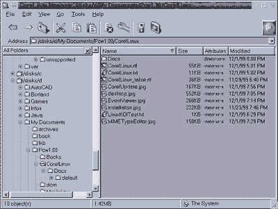 Рис. 2 Здесь вы найдете параметры дисплея, несколько популярных экранных тем, среди которых я сразу же отыскал и установил приятную для глаз голубоватую палитру Sun CDE. Отдельные элементы среды могут быть настроены индивидуально. Вообще дисплейные настройки работают очень хорошо, что необычно для Linux. Возьмите-ка RedHat и попробуйте настроить нужные параметры видео одним махом. С высокой долей вероятности вас ждет разочарование - без опыта это сделать не удастся. В Corel LINUX нужно произвести типовые действия, к которым вы привыкли в Windows: выбрать тип дисплея, цветовую глубину, разрешение экрана и частоту развертки монитора. Сплошное удовольствие, а не работа. То же самое касается и сетевых настроек, и сервера Samba. IP- и DNS-адреса выставляются за одну минуту, и перезагрузка всей системы не нужна. Примечательно то, что в Control Center настраиваемых параметров, требующих перезапуска Corel LINUX, вообще очень мало. В основном новые значения вступают в силу немедленно после нажатия кнопки Apply. Менеджер файловДля выполнения файловых операций в Corel LINUX есть утилита Corel File Manager (рис. 3).