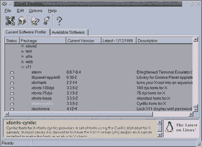 Рис. 4 Corel UpdateОперационная система должна быть не только хорошей, но и постоянно обновляемой. Кому нужна ОС, в которую нельзя внести "заплатки" от ошибок или добавить новую возможность? Любая коммерческая версия UNIX, да и Linux регулярно обновляется компаниями-разработчиками. В идеале "латание" операционки должно проходить незаметно для пользователя. Поэтому в составе Corel LINUX есть утилита Corel Update, ранее известная как Corel Package Manager. После запуска Corel Update смотрит, какие программы установлены на компьютере, затем ищет по заранее заданным адресам в Internet более свежие версии программ и, если таковые обнаружены, копирует их на компьютер пользователя и инсталлирует (рис. 5).