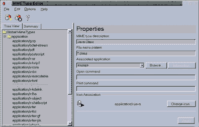 Рис. 5 Заметим, что Corel Update можно использовать и просто как средство просмотра "хозяйства" вашей системы. Task ManagerПросмотр текущих запущенных задач обязан быть удобным. Если использовать стандартную утилиту UNIX под названием ps, то вы узнаете все, что хотите, но, конечно, основательно повозитесь, отыскивая и сравнивая идентификаторы процессов. Обычный пользователь должен быть огражден от подобной канители. Удобный менеджер задач Task Manager значительно облегчает просмотр процессов в памяти, показа их отношений типа "родительский - порожденный" между ними в виде иерархического дерева. Фильтр позволяет определить, какие задачи нужно отображать: только пользовательские или только системные. Кроме того, "по совместительству" Task Manager работает как измеритель использования системных ресурсов. MIME Type EditorЕще одна важная утилита - утилита-редактор типов файлов, MIME Type Editor, заведующая связями между типами файлов и программами-серверами (рис. 6).