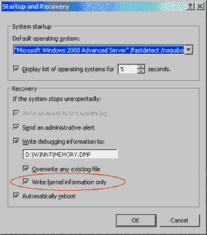 ЭКРАН 2. Конфигурирование аварийного дампа ядра Последним усовершенствованием для восстановления системы Windows 2000 после сбоя является новый параметр при создании аварийного дампа. В NT 4.0 вы можете сконфигурировать систему так, чтобы в случае аварийного останова содержимое физической памяти записывалось в файл на диск. В случае "обвала" системы генерируется дамп, размер которого оказывается чуть-чуть больше объема емкости памяти. Однако почти вся или большая часть данных в файле дампа не рассматривается службой технической поддержки, которой предстоит произвести анализ этого дампа при поиске неисправности, вызвавшей аварийный отказ. Инициатором аварийного останова системы и в NT, и в Windows 2000 выступает программа ядра. Именно ядро содержит полезную информацию относительно состояния системы в момент "обвала", включая сведения о приложениях, которые были активны, о том, какие драйверы были загружены и какой именно код выполнялся в самый последний момент. Чаще всего, собственные данные активных приложений (данные режима пользователя), содержащиеся в физической памяти, не рассматриваются для определения причины аварии и лишь увеличивают размер дампа. Специалисты Microsoft учли эту проблему и добавили новый параметр в окно Startup and Recovery для Windows 2000(см. Экран 2). Параметр Write kernel information only ("Записывать только информацию ядра") исключает все собственные данные приложений. Когда этот параметр установлен, программы анализа дампа (Crash analysis tools), входящие в состав Windows 2000, в том числе dumpexam и WinDbg, "поймут", что дамп содержит сведения только о ядре системы, и будут соответствующим образом интерпретировать его. Место на диске, которое экономится с помощью этого параметра, от системы к системе, и даже от одной аварии к другой, будет сильно варьироваться. Однако типичный размер дампа для 128-мегабайтной системы составляет обычно около 40 Мбайт, в то время как полный дамп памяти обошелся бы в 128 Мбайт.