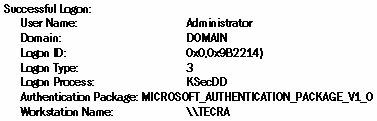 РИСУНОК 1. Событие номер 528. Событие входа в систему также фиксирует информацию о типе входа Logon Type, т. е. то, как пользователь вошел в систему. Тип входа 2 соответствует интерактивному входу с консоли, например, с помощью монитора и клавиатуры. Если пользователь подключается к диску на другом компьютере или как-либо еще использует сетевой ресурс, то выполняется сетевой вход с типом 3. Так, если был зафиксирован тип входа 2, то кто-то вошел в систему с локальной консоли именно этого компьютера, а если тип 3, значит, кто-то подключился к системе по сети. Тип входа 5 фиксируется при запуске службы с указанием конкретной учетной записи пользователя. При использовании планировщика задач производства независимых компаний, например Argent Queue Manager компании Argent Software, система фиксирует событие номер 528 с типом входа 4, что соответствует заданию на выполнение командного файла. При разблокировании рабочей станции записывается событие с типом входа 7. Фиксируются также все неудачные попытки входа в систему Logon Failure. При этом чаще всего записывается системное событие 529, соответствующее указанию неверного имени пользователя или пароля - Unknown user name or bad password.