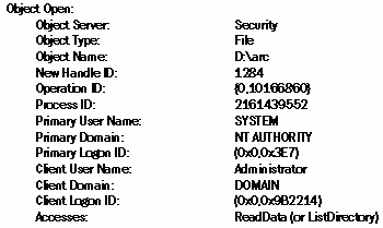 РИСУНОК 2. Событие номер 560. Основные два события аудита доступа к объектам: object opened и handle closed. Первое фиксирует открытие объекта (номер 560) , а второе - его закрытие (событие 562). Это взаимодополняющие друг друга события, подобные событиям входа и выхода из системы. Успешное событие номер 560 (см. Рисунок 2) записывает информацию об открытом объекте, а также имя пользователя и название приложения, которое воспользовалось объектом, тип доступа и дескриптор Handle ID. Handle ID является уникальным кодом для контроля операционной системы за каждым объектом. Он напоминает описанный выше номер сессии пользователя. Найдя пару событий открытия и закрытия (560 и 562) с одним и тем же значением Handle ID, можно выяснить время работы пользователя с данным объектом. Вместе с этим дескриптором событие номер 560 записывает и номер сессии пользователя (см. Рисунок 2), что позволяет выяснить, в какой именно сессии тот обращался к объекту. События хранят информацию о двух пользователях - об основном и о клиенте. При открытии файла на локальном компьютере с помощью обычного приложения, такого, как Microsoft Word, существенна только информация об основном пользователе. Однако при доступе к объекту из клиент-серверных приложений, которые разграничивают доступ к данным на основе базы пользователей системы, фиксируются оба типа пользователей: основной - соответствует учетной записи клиент-серверного приложения, а клиентский - соответствует пользователю, от имени которого работает сервер. Типичным примером является доступ к файловым ресурсам сервера. Так, при доступе к файлу на другом компьютере через сеть служба Workstation обращающегося к файлу компьютера соединяется со службой Server компьютера с предоставляемым ресурсом, при этом происходит тип 3 входа в систему. Перед обработкой любого запроса сервер аутентифицирует пользователя и записывает события доступа к объекту с указанием основного пользователя и клиента. В этом случае основным пользователем будет SYSTEM, поскольку именно под данной учетной записью запускается служба Server. Информация о клиенте соответствует имени пользователя, которое применялось для доступа к ресурсу; обычно это одна из учетных записей пользователей домена. Поле типа доступа Accesses в событии номер 560 хранит вид использованного метода доступа к объекту. Значения этого поля соответствуют возможным типам полномочий доступа к объектам ACL. Так, при редактировании текстового файла в редакторе WordPad Windows NT фиксирует событие 560 с типом доступа для чтения ReadData, записи WriteData и добавления AppendData. Событие 560 также сохраняет информацию о номере процесса Process ID. Этот номер позволяет определить, какая именно программа обратилась к объекту. Например, можно точно выяснить, использовалось ли при редактировании текстового файла приложение Word, WordPad или Notepad. Однако это при условии, что редактировался локальный файл. Если же пользователь обращался к объекту через сеть, фиксируется номер процесса, соответствующий серверному приложению. Третьим важным событием в категории аудита объектов является событие номер 564, удаление объекта - object deleted. Оно записывает только дескриптор и номер процесса. Чтобы разобраться, какой именно объект и каким пользователем был удален, необходимо отыскать по значению Handle ID соответствующее событие 560 открытия объекта. В событии номер 560 есть вся необ