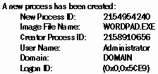 РИСУНОК 3. Событие номер 592. Эта категория аудита в приложении User Manager называется аудитом выполняющихся задач - process tracking, а в документации по Windows NT и в программе Event Viewer используется термин "детальный аудит" - detailed tracking. Как бы то ни было, данная категория позволяет проследить за тем, какие именно программы были запущены на рабочей станции и какие программы выполнялись на сервере. В этой категории также существуют два основных события - создание нового процесса, событие номер 592, и завершение процесса, событие номер 593. Найдя пару событий 592 и 593, имеющих один и тот же номер процесса Process ID, можно определить общее время работы того или иного приложения. Поле названия исполнительного модуля Image File Name хранит имя файла, соответствующего приложению. Так, при запуске WordPad это поле будет содержать значение WORDPAD.EXE (см. Рисунок 3). К сожалению, событие не записывает полный путь, и судить о точном размещении исполняемого файла нельзя. В поле имени пользователя User Name хранится информация о том, кто запустил приложение. Кроме того, по значению поля номера сеанса Logon ID пользователя можно отыскать соответствующее событие номер 528 и выяснить все подробности о сеансе, в котором запускалось приложение. С помощью поля номера запустившего приложение процесса Creator Process ID можно найти соответствующее событие номер 592, из которого выяснить, какая программа инициировала запуск нового процесса. Аудит выполняющихся задач может оказаться очень полезным на рабочих станциях, в особенности при изучении активности тех или иных пользователей. Если при этом задействовать аудит доступа к объектам на серверах, то можно построить довольно четкую картину работы пользователей. Аудит сеансов работы пользователей, аудит доступа к объектам системы и аудит выполняющихся задач являются тремя важнейшими категориями в журнале безопасности Windows NT. Можно связать сеансы работы пользователей, процессы и доступ к объектам и построить точную картину деятельности пользователей (см. Рисунок 4). К сожалению, Event Viewer не способен фильтровать события по значениям их параметров, так что использовать номера Logon ID, Process ID и Handle ID весьма трудно. Однако можно применить функцию поиска по значению параметра и вручную составить необходимые цепочки событий. Можно также воспользоваться другими программами обработки журнала безопасности Windows NT, которые позволяют отфильтровывать события по различным критериям. При настройке аудита журнала для этих трех категорий нужно знать, какие компьютеры (рабочие станции, серверы, контроллеры домена) в какие журналы будут записывать те или иные события. Следует помнить, что аудит доступа к объектам системы и аудит выполняющихся задач могут существенно понизить быстродействие системы. В следующий раз мы рассмотрим остальные категории аудита, как-то: аудит управления учетными записями пользователей, изменения системной политики, использования полномочий и системных событий.