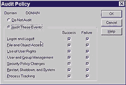 Анализируем журнал безопасности Windows NTЖурнал "Windows 2000 Magazine", #03/2000 Франклин Р. Смит Журнал безопасности Security Log может использоваться для отслеживания (аудита) большинства действий пользователей в системе. Существует три основные категории такого аудита - это аудит сеансов работы пользователей, аудит доступа к объектам системы и аудит выполняющихся задач. Эти категории дают основную информацию при наблюдении за действиями пользователей. Системная политика аудита настраивается в меню Policies-Audit-Audit Policy, вызываемом из программы User Manager (см. Экран 1). Данное диалоговое окно позволяет выбрать, какие из семи категорий фиксировать в локальном журнале безопасности, а какие нет. Сеансы работы пользователей
