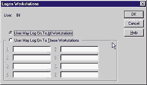 ЭКРАН 2. Выбор рабочих станций, с которых пользователь имеет право войти в систему. Если учетная запись пользователя недоступна или заблокирована, то попытка входа отвергается, и записывается событие с номером соответственно 531 или 539. Событие номер 530 указывает, что пользователь пытался войти в систему в недозволенное ему время или день недели. Если учетная запись пользователя просрочена или устарел пароль, то фиксируется соответственно событие 532 или 535. Если пользователь ограничен входом лишь на некоторые рабочие станции (см. Экран 2), а он пытается войти с другого компьютера, то запишется событие номер 533. Можно ограничить права пользователя на выполнение определенных типов входа в различные системы. Если пользователь, которому запрещен доступ к какому-то компьютеру по сети, все же пытается обратиться к его ресурсу или реестру, то он получит отказ, а в журнал безопасности запишется событие с номером 534. Такое же событие будет зафиксировано при попытке пользователя войти в систему с консоли, если это ему запрещено. При попытке запустить службу с использованием учетной записи пользователя, не имеющей права на запуск служб (права Logon as a service), также будет зафиксировано событие номер 534. Кроме того, событие 534 запишется и при попытке запуска задания с исполнением командного файла от имени учетной записи без права Logon as a batch job. При всех других отказах в аутентификации фиксируется событие с номером 537, т. е. An unexpected error occurred during logon - отказ по неизвестной причине. Тип входа фиксируется при всех попытках входа в систему, независимо от их результата. Более подробную информацию можно найти в документе Microsoft "Аудит аутентификации пользователей" (см. http://support.microsoft.com/support/kb/articles/q174/0/73.asp). Аутентификация в Windows NT имеет распределенную природу. Особенно ярко это проявляется при слежении за входом в систему и выходом из нее. Зачастую аудит на рабочей станции, имеющей учетную запись в домене, воспринимается уже как "вход в домен", вместо настоящего момента входа в домен или же входа на контроллер домена с использованием учетной записи домена. Аудит на рабочей станции означает лишь регистрацию на рабочей станции. Но поскольку используется учетная запись домена, сама рабочая станция не может аутентифицировать пользователя. Рабочая станция лишь посылает сведения о пользователе на контроллер домена по протоколу NTLM (NT LAN Manager). Контроллер домена проверяет правильность пароля и сразу же забывает о пользователе. Сеанс работы пользователя поддерживает сама рабочая станция до самого момента выхода из системы. Разумеется, именно рабочая станция и записывает в свой журнал системы безопасности информацию о сессии пользователя. Для получения общей картины работы пользователей домена зачастую можно обойтись без анализа журналов безопасности на всех без исключения рабочих станциях. Дело в том, что сразу же после успешного входа пользователя обычно выполняется автоматическое подключение сетевых дисков, расположенных на файл-серверах. Именно журналы безопасности файл-серверов и следует просматривать, отслеживая события входа в систему с типом 3. Из-за отсутствия централизованной фиксации входов в систему для домена бывает трудно отследить попытки несанкционированного доступа. Однако, хотя контроллеры домена и не фиксируют все неудавшиеся попытки входа, 