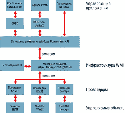 Внутри Windows Management InterfaceЖурнал "Windows 2000 Magazine", #03/2000 Поддержка задач управления предприятиемС самой первой версии операционная система Windows NT включала в себя встроенные средства мониторинга производительности и системных событий. Прикладные программы и сама система обычно выдают сообщения об ошибках и диагностические сообщения с помощью Event Manager. Встроенная в Windows NT утилита Event Viewer позволяет администраторам просматривать события, произошедшие как на локальном компьютере, так и на других машинах в сети. Подобным образом Performance API позволяет прикладным программам и подсистемам собирать статистику по производительности, которую администраторы затем могут просмотреть через Performance Monitor. Хотя средства NT для сбора статистики о событиях в системе и производительности отвечают большинству требований, они все же имеют ряд ограничений. Например, интерфейсы программирования этих средств отличаются друг от друга, что увеличивает сложность прикладных программ сбора данных, контролирующих и события и производительность. Эффективность Performance API может быть низкой, особенно в сети, так как этот интерфейс может предоставить "все или ничего": у приложения нет возможности запросить информацию о производительности отдельных компонентов. Вероятно, самый существенный недостаток современных средств контроля состоит в том, что они имеют очень небольшую расширяемость, и ни одно не обеспечивает возможность двухстороннего взаимодействия с API управления, которое так необходимо. Обычно прикладные программы предоставляют данные в определенных форматах для регистрации событий или сбора других данных. Performance API не дает приложению никакой возможности для получения уведомлений о событиях, связанных с производительностью, и прикладные программы, которые запрашивают у Event Manager уведомления о событиях, не могут ограничить извещение отдельными типами событий или данных. Наконец, клиенты или средства сбора информации не имеют возможности связываться с источником событий или рабочих данных через Event Manager или Performance API. Создание интерфейса Windows Management Interface (WMI) - следующий шаг к реализации усовершенствованной поддержки управления средствами Windows. WMI разработан специалистами Microsoft на базе технологии управления предприятием через Web - Web-Based Enterprise Management (WBEM). WBEM - это стандарт, определенный консорциумом Distributed Management Task Force (DMTF). WBEM определяет структуру расширяемого набора данных о предприятии и возможности администрирования, необходимые для управления локальными и удаленными системами, включающими произвольные компоненты. Разработчики Microsoft реализовали WMI в Windows 98 и в Win95 OSR2, сделали его доступным для NT 4.0, начиная с Service Pack 4 (SP4), и, наконец, интегрировали в Windows 2000. Тем не менее в большей степени WMI предназначен для использования в Windows 2000. Так как независимые производители уже начали поставлять инструментальные средства управления, основанные на WMI, администраторы получат возможность удаленно управлять всеми компонентами своих систем (Windows 2000, NT или 9x). В этой статье мы заглянем внутрь WMI. То, что здесь будет рассказано о WMI, применимо ко всем платформам Windows, но при обсуждении подробностей выполнения я буду делать акцент на Windows 2000. Архитектура WMIАрхитектура WMI состоит из четырех сегментов, показанных на Рисунке 1: управляющие программы (management applications), ядро WMI (WMI infrastructure),