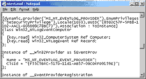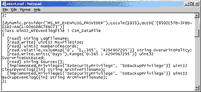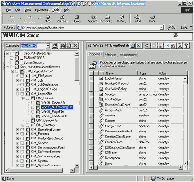 ЭКРАН 1. Просмотр наследования классов с помощью браузера классов CIM Studio. Как я упоминал вначале, разработчики провайдеров WMI-классов пишут свои классы на языке MOF. Экран 2 показывает определение класса Win32_NTEventlogFile, который был выбран на Экране 1. Отметим корреляцию между первыми шестью свойствами в правой панели списка на Экране 1 и определениями этих же свойств MOF-файла на Экране 2. CIM Studio использует желтые стрелки, чтобы показать наследование подобных свойств от родительского класса. Поэтому мы не видим определений этих свойств в определении класса Win32_ NTEventlogFile. Один из терминов, который в связи с этим стоит рассмотреть, - динамический (DYNAMIC) провайдер. Он является описательным указателем (характеристикой) для класса Win32_ NTEventlogFile, показанного в MOF-файле на Экране 2. Этот термин означает, что инфраструктура WMI запрашивает WMI-провайдера о значениях свойств, ассоциированных с классом, тогда, когда управляющее приложение запрашивает эти свойства. СТАТИЧЕСКИМ является тот класс, для которого провайдер сохраняет свойства в репозитарии WMI; инфраструктура WMI ссылается на репозитарий для получения значений, а не опрашивает для этого провайдера. Поскольку модифицирование репозитария - операция относительно дорогая, динамические провайдеры более эффективны для объектов, у которых изменение свойств происходит часто.