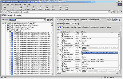 ЭКРАН 3. Просмотр зависимости классов. Многие типы объектов так или иначе связаны с друг другом. Например, объект "компьютер" имеет процессор, программное обеспечение, операционную систему, активные процессы и т. д. WMI позволяет провайдерам создавать классы зависимости, чтобы задать логическую взаимосвязь между двумя различными классами. Классы зависимости сопоставляют один класс с другим, поэтому имеют только два свойства. Поскольку свойства - это ссылки на классы, они состоят из имени класса и модификатора Ref. На Экране 3 показана зависимость, в которой MOF-файл провайдера EventLog ассоциирует класс Win32_ NTLogEvent с классомWin32_ComputerSystem. Получая объект, приложение управления может сделать запрос ассоциированным объектам. Таким образом провайдер создает иерархию объектов. На Экране 4 показан WMI-браузер объектов Object Browser (еще одно средство разработки, включенное в SDK) с корнем пространства имен CIMV2. Системные компоненты Win32 обычно размещают свои объекты в пределах пространства имен CIMV2. Object Browser сначала выводит экземпляр объекта Win32_ComputerSystem MARKLAPTOP, который соответствует компьютеру. Затем он получает объекты, связанные с Win32_ComputerSystem, и отображает их ниже MARKLAPTOP. Интерфейс пользователя Object Browser обозначает связанные объекты значком "папка с двойной стрелкой". Связанные с типом класса объекты отображаются ниже папки.
