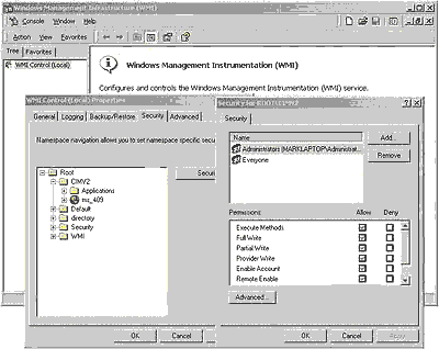 ЭКРАН 4. Применение браузера объектов Object Browser для просмотра корня пространства имен. Object Browser показывает, что зависимый класс провайдера файла регистрации событий Win32_NTLogEventComputer расположен ниже MARKLAPTOP и что существуют многочисленные образцы класса Win32_NTLogEvent. На Экране 3 видно, как MOF-файл определяет класс Win32_NTLogEventComputer, чтобы сопоставить класс Win32_ ComputerSystem с классом Win32_ NTLogEvent. Указание экземпляра события Win32_NTLogEvent в Object Browser позволяет увидеть свойства класса в правой области окна. Microsoft Object Browser, по замыслу его создателей, должен был помогать WMI-разработчикам исследовать объекты, хотя приложение управления выполнило бы те же самые действия и представило информацию более понятным способом. Реализация WMIИнфраструктура WMI представлена прежде всего исполняемым файлом \winnt\system32\wbem\winmgmt.exe. Это служба Windows 2000, которая запускается при старте управляющего приложения через Service Control Manager или при первом обращении провайдера WMI к WMI API. Большинство компонентов WMI постоянно находятся в \winnt\system32 и \winnt\system32\wbem, включая MOF-файлы Win32, встроенный провайдер DLL и управляющее приложение WMI DLL. В каталоге \winnt\system32\wbem можно найти ntevt.mof - MOF-файл провайдера журнала событий EventLog, а также ntevt.dll, библиотеку DLL провайдера EventLog, которую загружает winmgmt.exe. Каталоги ниже \winnt\system32 \wbem вмещают репозитарий, файлы журналов и MOF-файлы. WMI реализует репозитарий, называемый Object Management CIM (CIMOM) репозитарием, как файл \winnt\system32\wbem\repository\cim.rep. Служба WinMgmt выбирает многочисленные параметры настройки, связанные с репозитарием (включая различные параметры, такие, как расположение резервной копии CIMOM и интервалы копирования), из раздела системного реестра HKEY_LOCAL_MACHINE\SOFTWARE\Microsoft\WBEM\CIMOM. Разработчики Microsoft хотели расширить возможности управления всеми аспектами Windows 2000, так что пришлось создать механизм взаимодействия драйверов устройств с WMI. Драйверы устройств используют несколько новых интерфейсов для предоставления данных WMI и исполнения команд, получаемых от WMI. Команды WMI System Control commands названы в Microsoft командами управления системой. Разработчики присвоили название провайдера Windows Driver Model (WDM) провайдеру драйверов устройств, потому что одинаковые интерфейсы WMI в драйверах Windows 2000 существуют и для Win98-драйверов. Поскольку это кросс-платформенные интерфейсы, они включены в зону ответственности WDM, кросс-платформенную архитектуру драйверов устройств. Windows 2000 размещает объекты WDM в пространстве имен \root\wmi. Система безопасности WMIWMI осуществляет защиту на уровне пространства имен. Если приложение управления успешно соединяется с пространством имен, то оно имеет право просматривать свойства всех объектов и обращаться к ним в этом пространстве. Администратор может использовать приложение управления WMI для контроля доступа пользователей к пространству имен. Чтобы запустить приложение управления WMI, следует выбрать Start/Administrative Tools/Computer Management. Затем нужно открыть Services and Applications, щелкнуть правой кнопкой мыши на WMI Control и выбрать Properties, чтобы открыть диалоговое окно WMI Control (Local) Properties, показанное на Экране 5. Чтобы настроить защиту для пространства имен, на закладке Security следует выбрать нужное пространство имен и нажать Security. Другие закладки в диалоговом окне позволяют изменять функции и резервировать параметры настройки, хранимые в системном реестре.