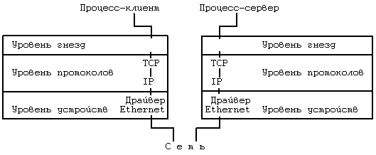 Рисунок 11.18. Модель с использованием гнезд Структура ядра имеет три уровня: гнезд, протоколов и устройств (Рисунок 11.18). Уровень гнезд выполняет функции интерфейса между обращениями к операционной системе (системным функциям) и средствами низких уровней, уровень протоколов содержит модули, обеспечивающие взаимодействие процессов (на рисунке упомянуты протоколы TCP и IP), а уровень устройств содержит драйверы, управляющие сетевыми устройствами. Допустимые сочетания протоколов и драйверов указываются при построении системы (в секции конфигурации); этот способ уступает по гибкости вышеупомянутому потоковому механизму. Процессы взаимодействуют между собой по схеме клиент-сервер: сервер ждет сигнала от гнезда, находясь на одном конце дуплексной линии связи, а процессы-клиенты взаимодействуют с сервером через гнездо, находящееся на другом конце, который может располагаться на другой машине. Ядро обеспечивает внутреннюю связь и передает данные от клиента к серверу. Гнезда, обладающие одинаковыми свойствами, например, опирающиеся на общие соглашения по идентификации и форматы адресов (в протоколах), группируются в домены (управляемые одним узлом). В системе BSD 4.2 поддерживаются домены: "UNIX system" - для взаимодействия процессов внутри одной машины и "Internet" (межсетевой) - для взаимодействия через сеть с помощью протокола DARPA (Управление перспективных исследований и разработок Министерства обороны США) (см. [Postel 80] и [Postel 81]). Гнезда бывают двух типов: виртуальный канал (потоковое гнездо, если пользоваться терминологией Беркли) и дейтаграмма. Виртуальный канал обеспечивает надежную доставку данных с сохранением исходной последовательности. Дейтаграммы не гарантируют надежную доставку с сохранением уникальности и последовательности, но они более экономны в смысле использования ресурсов, поскольку для них не требуются сложные установочные операции; таким образом, дейтаграммы полезны в отдельных случаях взаимодействия. Для каждой допустимой комбинации типа домен-гнездо в системе поддерживается умолчание на используемый протокол. Так, например, для домена "Internet" услуги виртуального канала выполняет протокол транспортной связи (TCP), а функции дейтаграммы - пользовательский дейтаграммный протокол (UDP). Существует несколько системных функций работы с гнездами. Функция socket устанавливает оконечную точку линии связи. sd = socket(format,type,protocol); Format обозначает домен ("UNIX system" или "Internet"), type - тип связи через гнездо (виртуальный канал или дейтаграмма), а protocol - тип протокола, управляющего взаимодействием. Дескриптор гнезда sd, возвращаемый функцией socket, используется другими системными функциями. Закрытие гнезд выполняет функция close. Функция bind связывает дескриптор гнезда с именем: bind(sd,address,length); где sd - дескриптор гнезда, address - адрес структуры, определяющей идентификатор, характерный для данной комбинации домена и протокола (в функции socket). Length - длина структуры address; без этого параметра ядро не знало бы, какова длина структуры, поскольку для разных доменов и протоколов она может быть различной. Например, для домена "UNIX system" структура содержит имя файла. Процессы-серверы связывают гнезда с именами и объявляют о состоявшемся присвоении имен процессам-клиентам. С помощью системной функции connect делается запрос на подключение к существующему гнезду: connect(sd,addre