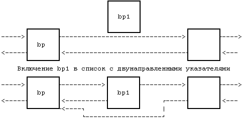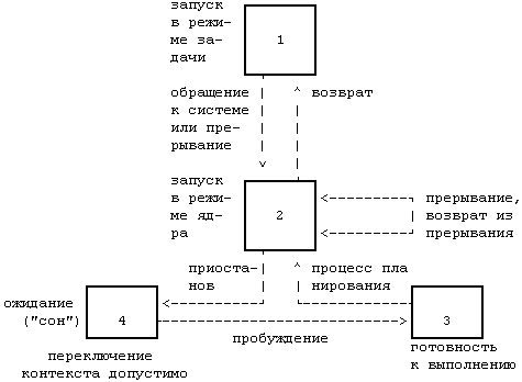 Поскольку процессор в каждый момент времени выполняет только один процесс, в состояниях 1 и 2 может находиться самое большее один процесс. Эти два состояния соответствуют двум режимам выполнения, режиму задачи и режиму ядра. 2.2.2.3 Переходы из состояния в состояние Состояния процесса, перечисленные выше, дают статическое представление о процессе, однако процессы непрерывно переходят из состояния в состояние в соответствии с определенными правилами. Диаграмма переходов представляет собой ориентированный граф, вершины которого представляют собой состояния, в которые может перейти процесс, а дуги - события, являющиеся причинами перехода процесса из одного состояния в другое. Переход между двумя состояниями разрешен, если существует дуга из первого состояния во второе. Несколько дуг может выходить из одного состояния, однако процесс переходит только по одной из них в зависимости от того, какое событие произошло в системе. На Рисунке 2.6 представлена диаграмма переходов для состояний, перечисленных выше. Как уже говорилось выше, в режиме разделения времени может выполняться одновременно несколько процессов, и все они могут одновременно работать в режиме ядра. Если им разрешить свободно выполняться в режиме ядра, то они могут испортить глобальные информационные структуры, принадлежащие ядру. Запрещая произвольное переключение контекстов и управляя возникновением событий, ядро защищает свою целостность. Ядро разрешает переключение контекста только тогда, когда процесс переходит из состояния "запуск в режиме ядра" в состояние "сна в памяти". Процессы, запущенные в режиме ядра, не могут быть выгружены другими процессами; поэтому иногда говорят, что ядро не выгружаемо, при этом процессы, находящиеся в режиме задачи, могут выгружаться системой. Ядро поддерживает целостность своих информационных структур, поскольку оно не выгружаемо, таким образом решая проблему "взаимного исключения" - обеспечения того, что критические секции программы выполняются в каждый момент времени в рамках самое большее одного процесса. В качестве примера рассмотрим программу (Рисунок 2.7) включения информационной структуры, чей адрес содержится в указателе bp1, в список с использованием указателей после структуры, чей адрес содержится в bp. Если система разрешила переключение контекста при выполнении ядром фрагмента программы, возможно возникновение следующей ситуации. Предположим, ядро выполняет программу до комментариев и затем осуществляет переключение контекста. Список с использованием сдвоенных указателей имеет противоречивый вид: структура bp1 только наполовину входит в этот список. Если процесс следует за передними указателями, он обнаружит bp1 в данном списке, но если он последует за фоновыми указателями, то вообще не найдет структуру bp1 (Рисунок 2.8). Если другие процессы будут обрабатывать указатели в списке до момента повторного запуска первого процесса, структура списка может постоянно разрушаться. Система UNIX предупреждает возникновение подобных ситуаций, запрещая переключение контекстов на время выполнения процесса в режиме ядра. Если процесс переходит в состояние "сна", делая допустимым переключение контекста, алгоритмы ядра обеспечивают защиту целостности информационных структур системы. ![]() Рисунок 2.6. Состояния процесса и пере