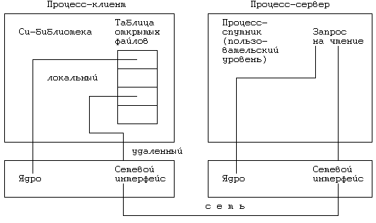 Рисунок 13.9. Формулирование запросов к файловому серверу (процессору) Всю оставшуюся часть раздела мы посвятим рассмотрению модели системы, использующей связь типа Newcastle, в которой ядро не занимается распознаванием удаленных файлов; эта функция полностью возлагается на подпрограммы из стандартной Си-библиотеки, выполняющие в данном случае роль системного интерфейса. Эти подпрограммы анализируют первую компоненту имени файла, в обоих описанных способах идентифицирования содержащую признак удаленности файла. В этом состоит отступление от заведенного порядка, при котором библиотечные подпрограммы не занимаются синтаксическим разбором имен файлов. На Рисунке 13.9 показано, каким образом формулируются запросы к файловому серверу. Если файл локальный, ядро локальной системы обрабатывает запрос обычным способом. Рассмотрим обратный случай: open("/../sftig/fs1/mjb/rje/file",O_RDONLY);