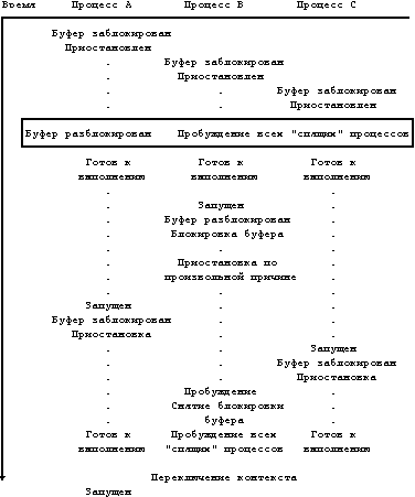2.4 УПРАВЛЕНИЕ СИСТЕМОЙК управляющим процессам, грубо говоря, относятся те процессы, которые выполняют различные функции по обеспечению благополучной работы пользователей системы. К таким функциям относятся форматирование дисков, создание новых файловых систем, восстановление разрушенных файловых систем, отладка ядра и др. С концептуальной точки зрения, между управляющими и пользовательскими процессами нет разницы. Они используют один и тот же набор обращений к операционной системе, доступный для всех. Управляющие процессы отличаются от обычных пользовательских процессов только правами и привилегиями, которыми они обладают. Например, режимы разрешения доступа к файлу могут предусматривать предоставление возможности работы с файлами для управляющих процессов и отсутствие такой возможности для обычных пользователей. Внутри системы ядро выделяет особого пользователя, именуемого суперпользователем, и наделяет его особыми привилегиями, о чем мы еще поговорим ниже. Пользователь может стать суперпользователем, если соответствующим образом зарегистрируется в системе или запустит специальную программу. Привилегии суперпользователя будут рассмотрены в следующих главах. Если сказать коротко, ядро системы не выделяет управляющие процессы в отдельный класс. ![]() Рисунок 2.9. Многократная приостановка выполнения процессов, вызванная блокировкой