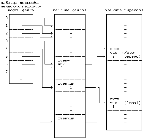 Рисунок 5.20. Структуры данных после выполнения функции dup Возможно, dup - функция, не отличающаяся изяществом, поскольку она предполагает, что пользователь знает о том, что система возвратит свободную точку входа в таблице пользовательских дескрипторов, имеющую наименьший номер. Однако, она служит важной задаче конструирования сложных программ из более простых конструкционных блоков, что, в частности, имеет место при создании конвейеров, составленных из командных процессоров. Рассмотрим программу, приведенную на Рисунке 5.21. В переменной i хранится дескриптор файла, возвращаемый в результате открытия файла "/etc/passwd", а в переменной j - дескриптор файла, возвращаемый системой в результате дублирования дескриптора i с помощью функции dup. В адресном пространстве процесса оба пользовательских дескриптора, представленные переменными i и j, ссылаются на одну и ту же запись в таблице файлов и поэтому используют одно и то же значение смещения внутри файла. Таким образом, первые два вызова процессом функции read реализуют последовательное считывание данных, и в буферах buf1 и buf2 будут располагаться разные данные. Совсем другой результат получается, когда процесс открывает один и тот же файл дважды и читает дважды одни и те же данные (раздел 5.2). Процесс может освободить с помощью функции close любой из файловых дескрипторов по своему желанию, и ввод-вывод получит нормальное продолжение по другому дескриптору, как показано на примере. В частности, процесс может "закрыть" дескриптор файла стандартного вывода (файловый дескриптор 1), снять с него копию, имеющую то же значение, и затем рассматривать новый файл в качестве файла стандартного вывода. В главе 7 будет представлен более реалистический пример использования функций pipe и dup при описании особенностей реализации командного процессора.