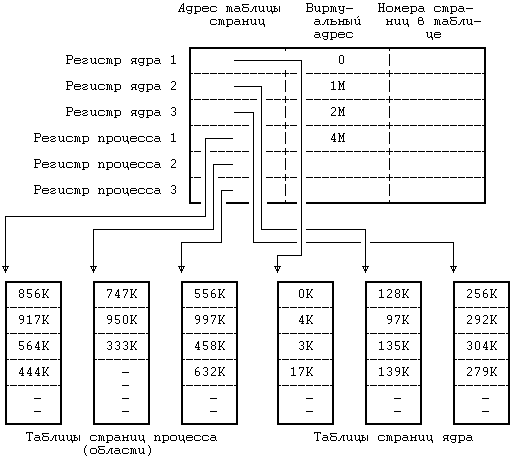 Рисунок 6.5. Преобразование виртуальных адресов в физические Организацию управления памятью попробуем пояснить на следующем простом примере. Пусть память разбита на страницы размером 1 Кбайт каждая, обращение к которым осуществляется через описанные ранее таблицы страниц. Регистры управления памятью в системе группируются по три; первый регистр в тройке содержит адрес таблицы страниц в физической памяти, второй регистр содержит первый виртуальный адрес, отображаемый с помощью тройки регистров, третий регистр содержит управляющую информацию, такую как номера страниц в таблице страниц и права доступа к страницам (только чтение, чтение и запись). Такая модель соответствует вышеописанной модели области. Когда ядро готовит процесс к выполнению, оно загружает тройки регистров соответствующей информацией из записей частной таблицы областей процесса. Если процесс обращается к ячейкам памяти, расположенным за пределами принадлежащего ему виртуального пространства, создается исключительная ситуация. Например, если область команд имеет размер 16 Кбайт (Рисунок 6.5), а процесс обращается к виртуальному адресу 26К, создается исключительная ситуация, обрабатываемая операционной системой. То же самое происходит, если процесс пытается обратиться к памяти, не имея соответствующих прав доступа, например, пытается записать адрес в защищенную от записи область команд. И в том, и в другом примере процесс обычно завершается (более подробно об этом в следующей главе). 6.2.3 Размещение ядраНесмотря на то, что ядро работает в контексте процесса, отображение виртуальных адресов, связанных с ядром, осуществляется независимо от всех процессов. Программы и структуры данных ядра резидентны в системе и совместно используются всеми процессами. При запуске системы происходит загрузка программ ядра в память с установкой соответствующих таблиц и регистров для отображения виртуальных адресов ядра в физические. Таблицы страниц для ядра имеют структуру, аналогичную структуре таблицы страниц, связанной с процессом, а механизмы отображения виртуальных адресов ядра похожи на механизмы, используемые для отображения пользовательских адресов. На многих машинах виртуальное адресное пространство процесса разбивается на несколько классов, в том числе системный и пользовательский, и каждый класс имеет свои собственные таблицы страниц. При работе в режиме ядра система разрешает доступ к адресам ядра, при работе же в режиме задачи такого рода доступ запрещен. Поэтому, когда в результате прерывания или выполнения системной функции происходит переход из режима задачи в режим ядра, операционная система по договоренности с техническими средствами разрешает ссылки на адреса ядра, а при возврате в режим ядра эти ссылки уже запрещены. В других машинах можно менять преобразование виртуальных адресов, загружая специальные регистры во время работы в режиме ядра. На Рисунке 6.6 приведен пример, в котором виртуальные адреса от 0 до 4М-1 принадлежат ядру, а начиная с 4М - процессу. Имеются две группы регистров управления памятью, одна для адресов ядра и одна для адресов процесса, причем каждой группе соответствует таблица страниц, хранящая номера физических страниц со ссылкой на адреса виртуальных страниц. Адресные ссылки с использованием группы регистров ядра допус