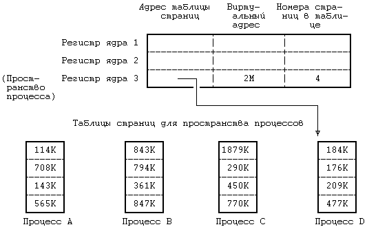 Рисунок 6.7. Карта памяти пространства процесса в ядре Предположим, например, что пространство процесса имеет размер 4 Кбайта и помещается по виртуальному адресу 2М. На Рисунке 6.7 показана карта памяти, где первые два регистра из группы относятся к программам и данным ядра (адреса и указатели не показаны), а третий регистр адресует к пространству процесса D. Если ядру нужно обратиться к пространству процесса A, оно копирует связанную с этим пространством информацию из соответствующей таблицы страниц в третий регистр. В любой момент третий регистр ядра описывает пространство текущего процесса, но ядро может сослаться на пространство другого процесса, переписав записи в таблице страниц с новым адресом. Информация в регистрах 1 и 2 для ядра неизменна, поскольку все процессы совместно используют программы и данные ядра.