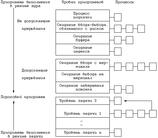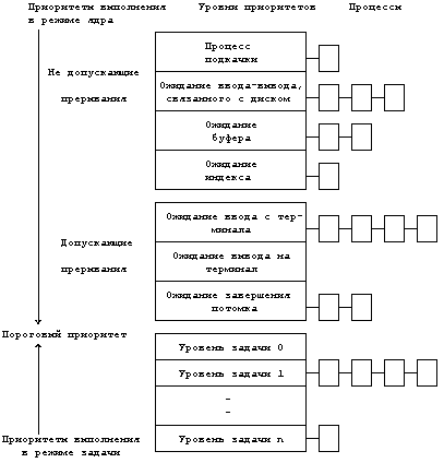 Рисунок 8.1. Алгоритм планирования выполнения процессов 8.1.2 Параметры диспетчеризацииВ каждой записи таблицы процессов есть поле приоритета, используемое планировщиком процессов. Приоритет процесса в режиме задачи зависит от того, как этот процесс перед этим использовал ресурсы ЦП. Можно выделить два класса приоритетов процесса (Рисунок 8.2): приоритеты выполнения в режиме ядра и приоритеты выполнения в режиме задачи. Каждый класс включает в себя ряд значений, с каждым значением логически ассоциирована некоторая очередь процессов. Приоритеты выполнения в режиме задачи оцениваются для процессов, выгруженных по возвращении из режима ядра в режим задачи, приоритеты выполнения в режиме ядра имеют смысл только в контексте алгоритма sleep. Приоритеты выполнения в режиме задачи имеют верхнее пороговое значение, приоритеты выполнения в режиме ядра имеют нижнее пороговое значение. Среди приоритетов выполнения в режиме ядра далее можно выделить высокие и низкие приоритеты: процессы с низким приоритетом возобновляются по получении сигнала, а процессы с высоким приоритетом продолжают оставаться в состоянии приостанова (см. раздел 7.2.1). Пороговое значение между приоритетами выполнения в режимах ядра и задачи на Рисунке 8.2 отмечено двойной линией, проходящей между приоритетом ожидания завершения потомка (в режиме ядра) и нулевым приоритетом выполнения в режиме задачи. Приоритеты процесса подкачки, ожидания ввода-вывода, связанного с диском, ожидания буфера и индекса являются высокими, не допускающими прерывания системными приоритетами, с каждым из которых связана очередь из 1, 3, 2 и 1 процесса, соответственно, в то время как приоритеты ожидания ввода с терминала, вывода на терминал и завершения потомка являются низкими, допускающими прерывания системными приоритетами, с каждым из которых связана очередь из 4, 0 и 2 процессов, соответственно. На рисунке представлены также уровни приоритетов выполнения в режиме задачи (*). Ядро вычисляет приоритет процесса в следующих случаях: