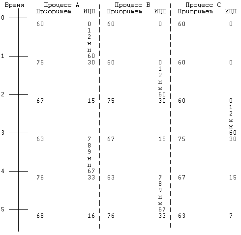 Рисунок 8.3. Переход процесса из одной очереди в другую 8.1.3 Примеры диспетчеризации процессовНа Рисунке 8.4 показана динамика изменений приоритетов процессов A, B и C в версии V при следующих допущениях: все эти процессы были созданы с первоначальным приоритетом 60, который является наивысшим приоритетом выполнения в режиме задачи, прерывания по таймеру поступают 60 раз в секунду, процессы не используют вызов системных функций, в системе нет других процессов, готовых к выполнению. Ядро вычисляет полураспад показателя ИЦП по формуле: ИЦП = decay(ИЦП) = ИЦП/2; а приоритет процесса по формуле: приоритет = (ИЦП/2) + 60; Если предположить, что первым запускается процесс A и ему выделяется квант времени, он выполняется в течение 1 секунды: за это время таймер посылает системе 60 прерываний и столько же раз программа обработки прерываний увеличивает для процесса A значение поля, содержащего показатель ИЦП (с 0 до 60). По прошествии секунды ядро переключает контекст и, произведя пересчет приоритетов для всех процессов, выбирает для выполнения процесс B. В течение следующей секунды программа обработки прерываний по таймеру 60 раз повышает значение поля ИЦП для процесса B, после чего ядро пересчитывает параметры диспетчеризации для всех процессов и вновь переключает контекст. Процедура повторяется многократно, сопровождаясь поочередным запуском процессов на выполнение.