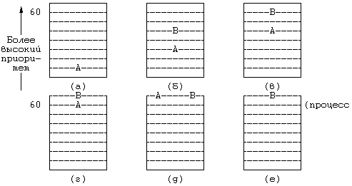 Рисунок 8.4. Пример диспетчеризации процессов Теперь рассмотрим процессы с приоритетами, приведенными на Рисунке 8.5, и предположим, что в системе имеются и другие процессы. Ядро может выгрузить процесс A, оставив его в состоянии "готовности к выполнению", после того, как он получит подряд несколько квантов времени для работы с ЦП и снизит таким образом свой приоритет выполнения в режиме задачи (Рисунок 8.5а). Через некоторое время после запуска процесса A в состояние "готовности к выполнению" может перейти процесс B, приоритет которого в тот момент окажется выше приоритета процесса A (Рисунок 8.5б). Если ядро за это время не запланировало к выполнению любой другой процесс (из тех, что не показаны на рисунке), оба процесса (A и B) при известных обстоятельствах могут на некоторое время оказаться на одном уровне приоритетности, хотя процесс B попадет на этот уровень первым из-за того, что его первоначальный приоритет был ближе (Рисунок 8.5в и 8.5г). Тем не менее, ядро запустит процесс A впереди процесса B, поскольку процесс A находился в состоянии "готовности к выполнению" более длительное время (Рисунок 8.5д) - это решающее условие, если выбор производится из процессов с одинаковыми приоритетами. В разделе 6.4.3 уже говорилось о том, что ядро запускает процесс на выполнение после переключения контекста: прежде чем перейти в состояние приостанова или завершить свое выполнение процесс должен переключить контекст, кроме того он имеет возможность переключать контекст в момент перехода из режима ядра в режим задачи. Ядро выгружает процесс, который собирается перейти в режим задачи, если имеется готовый к выполнению процесс с более высоким приоритетом. Такая ситуация возникает, если ядро вывело из состояния приостанова процесс с приоритетом, превышающим приоритет текущего процесса, или если в результате обработки прерывания по таймеру изменились приоритеты всех готовых к выполнению процессов. В первом случае текущий процесс не может выполняться в режиме задачи, поскольку имеется процесс с более высоким приоритетом выполнения в режиме ядра. Во втором случае программа обработки прерываний по таймеру решает, что процесс использовал выделенный ему квант времени, и поскольку множество процессов при этом меняют свои приоритеты, ядро выполняет переключение контекста. 8.1.4 Управление приоритетамиПроцессы могут управлять своими приоритетами с помощью системной функции nice: nice(value); где value - значение, в процессе пересчета прибавляемое к приоритету процесса: приоритет = (ИЦП/константа) + (базовый приоритет) + (значение nice) Системная функция nice увеличивает или уменьшает значение поля nice в таблице процессов на величину параметра функции, при этом только суперпользователю дозволено указывать значения, увеличивающие приоритет процесса. Кроме того, только суперпользователь может указывать значения, лежащие ниже определенного порога. Пользователи, вызывающие системную функцию nice для того, чтобы понизить приоритет во время выполнения интенсивных вычислительных работ, "удобны, приятны" (nice) для остальных пользователей системы, отсюда название функции. Процессы наследуют значение nice у своего родителя при выполнении системной функции fork. Функция nice действует только для выполняющихся процессов; процесс не может сбросить значение nice у другого процесса. С практиче