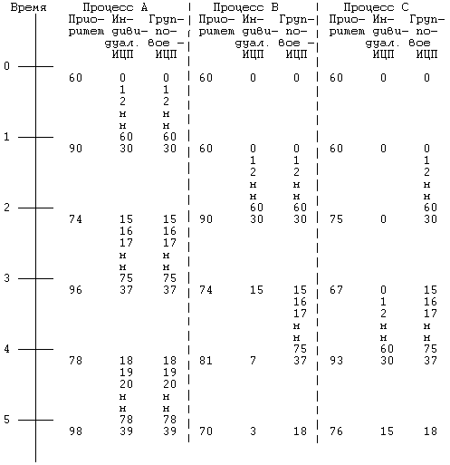 Рисунок 8.5. Планирование на основе кольцевого списка и приоритеты процессов 8.1.5 Планирование на основе справедливого разделаВышеописанный алгоритм планирования не видит никакой разницы между пользователями различных классов (категорий). Другими словами, невозможно выделить определенной совокупности процессов, например, половину сеанса работы с ЦП. Тем не менее, такая возможность имеет важное значение для организации работы в условиях вычислительного центра, где группа пользователей может пожелать купить только половину машинного времени на гарантированной основе и с гарантированным уровнем реакции. Здесь мы рассмотрим схему, именуемую "Планированием на основе справедливого раздела" (Fair Share Scheduler) и реализованную на вычислительном центре Indian Hill фирмы AT&T Bell Laboratories [Henry 84]. Принцип "планирования на основе справедливого раздела" состоит в делении совокупности пользователей на группы, являющиеся объектами ограничений, накладываемых обычным планировщиком на обработку процессов из каждой группы. При этом система выделяет время ЦП пропорционально числу групп, вне зависимости от того, сколько процессов выполняется в группе. Пусть, например, в системе имеются четыре планируемые группы, каждая из которых загружает ЦП на 25% и содержит, соответственно, 1, 2, 3 и 4 процесса, реализующих счетные задачи, которые никогда по своей воле не уступят ЦП. При условии, что в системе больше нет никаких других процессов, каждый процесс при использовании традиционного алгоритма планирования получил бы 10% времени ЦП (поскольку всего процессов 10 и между ними не делается никаких различий). При использовании алгоритма планирования на основе справедливого раздела процесс из первой группы получит в два раза больше времени ЦП по сравнению с каждым процессом из второй группы, в 3 раза больше по сравнению с каждым процессом из третьей группы и в 4 раза больше по сравнению с каждым процессом из четвертой. В этом примере всем процессам в группе выделяется равное время, поскольку продолжительность цикла, реализуемого каждым процессом, заранее не установлена. Реализация этой схемы довольно проста, что и делает ее привлекательной. В формуле расчета приоритета процесса появляется еще один термин - "приоритет группы справедливого раздела". В пространстве процесса также появляется новое поле, описывающее продолжительность ИЦП на основе справедливого раздела, общую для всех процессов из группы. Программа обработки прерываний по таймеру увеличивает значение этого поля для текущего процесса и ежесекундно пересчитывает значения соответствующих полей для всех процессов в системе. Новая компонента формулы вычисления приоритета процесса представляет собой нормализованное значение ИЦП для каждой группы. Чем больше процессорного времени выделяется процессам группы, тем выше значение этого показателя и ниже приоритет. В качестве примера рассмотрим две группы процессов (Рисунок 8.6), в одной из которых один процесс (A), в другой - два (B и C). Предположим, что ядро первым запустило на выполнение процесс A, в течение секунды увеличивая соответствующие этому процессу значения полей, описывающих индивидуальное и групповое ИЦП. В результате пересчета приоритетов по истечении секунды процессы B и C будут иметь наивысшие приоритеты. Допустим, что ядро выбирает на выполне