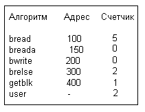 Рисунок 8.11. Адреса некоторых алгоритмов ядра На Рисунке 8.11 приведены гипотетические адреса некоторых процедур ядра. Пусть в результате 10 измерений, проведенных в моменты поступления прерываний по таймеру, были получены следующие значения счетчика команд: 110, 330, 145, адрес в пространстве задачи, 125, 440, 130, 320, адрес в пространстве задачи и 104. Ядро сохранит при этом те значения, которые показаны на рисунке. Анализ этих значений показывает, что система провела 20% своего времени в режиме задачи (user) и 50% времени потратила на выполнение алгоритма bread в режиме ядра. Если измерение параметров ядра выполняется в течение длительного периода времени, результаты измерений приближаются к истинной картине использования системных ресурсов. Тем не менее, описываемый механизм не учитывает время, потраченное на обработку прерываний по таймеру и выполнение процедур, блокирующих поступление прерываний данного типа, поскольку таймер не может прерывать выполнение критических отрезков программ и, таким образом, не может в это время обращаться к подпрограмме обработки прерываний драйвера параметров. В этом недостаток описываемого механизма, ибо критические отрезки программ ядра чаще всего наиболее важны для измерений. Следовательно, результаты измерения параметров ядра содержат определенную долю приблизительности. Уайнбергер [Weinberger 84] описал механизм включения счетчиков в главных блоках программы, таких как "if-then" и "else", с целью повышения точности измерения частоты их выполнения. Однако, данный механизм увеличивает время счета программ на 50-200%, поэтому его использование в качестве постоянного механизма измерения параметров ядра нельзя признать рациональным. На пользовательском уровне для измерения параметров выполнения процессов можно использовать системную функцию profil: profil(buff,bufsize,offset,scale); где buff - адрес массива в пространстве задачи, bufsize - размер массива, offset - виртуальный адрес подпрограммы пользователя (обычно, первой по счету), scale - способ отображения виртуальных адресов задачи на адрес массива. Ядро трактует аргумент "scale" как двоичную дробь с фиксированной точкой слева. Так, например, значение аргумента в шестнадцатиричной системе счисления, равное Oxffff, соответствует однозначному отображению счетчика команд на адреса массива, значение, равное Ox7fff, соответствует размещению в одном слове массива buff двух адресов программы, Ox3fff - четырех адресов программы и т.д. Ядро хранит параметры, передаваемые при вызове системной функции, в пространстве процесса. Если таймер прерывает выполнение процесса тогда, когда он находится в режиме задачи, программа обработки прерываний проверяет значение счетчика команд в момент прерывания, сравнивает его со значением аргумента offset и увеличивает содержимое ячейки памяти, адрес которой является функцией от bufsize и scale. Рассмотрим в качестве примера программу, приведенную на Рисунке 8.12, измеряющую продолжительность выполнения функций f и g. Сначала процесс, используя системную функцию signal, делает указание при получении сигнала о прерывании вызывать функцию theend, затем он вычисляет диапазон адресов программы, в пределах которых будет производиться измерение продолжительности (начиная с адреса функции main и кончая адресом функции theend), и, наконец, запускает функцию profil, сообщая ядру о том, что он собирается на