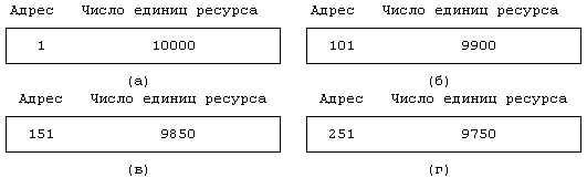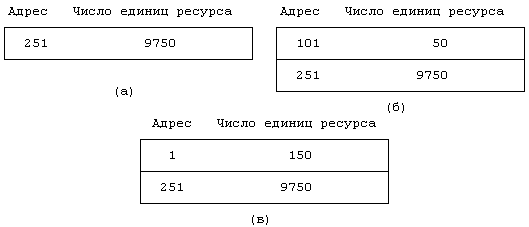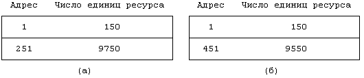 Рисунок 9.3. Выделение пространства на устройстве выгрузки Возвращаясь к предыдущему примеру, отметим, что если ядро освобождает 50 единиц ресурса, начиная с адреса 101, в карте памяти появится новая строка, поскольку освободившиеся ресурсы имеют адреса, не соприкасающиеся с адресами существующих строк карты. Если же затем ядро освободит 100 единиц ресурса, начиная с адреса 1, первая строка карты будет расширена, поскольку освободившиеся ресурсы имеют адрес, смежный с адресом первой строки. Эволюция состояний карты памяти для данного случая показана на Рисунке 9.4. Предположим, что ядру был сделан запрос на выделение 200 единиц (блоков) пространства устройства выгрузки. Поскольку первая строка карты содержит информацию только о 150 единицах, ядро привлекает для удовлетворения запроса информацию из второй строки (см. Рисунок 9.5). Наконец, предположим, что ядро освобождает 350 единиц пространства, начиная с адреса 151. Несмотря на то, что эти 350 единиц были выделены ядром в разное время, не существует причины, по которой ядро не могло бы освободить их все сразу. Ядро узнает о том, что освободившиеся ресурсы полностью закрывают разрыв между первой и второй строками карты, и вместо прежних двух создает одну строку, в которую включает и освободившиеся ресурсы.