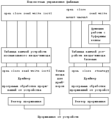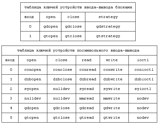 Рисунок 10.2. Пример заполнения таблиц ключей устройств ввода-вывода блоками и символами Драйвер устройства интерпретирует параметры вызова системной функции в отношении устройства. Драйвер поддерживает структуры данных, описывающие состояние каждой контролируемой единицы данного типа устройства; функции драйвера и программы обработки прерываний реализуются в соответствии с состоянием драйвера и с тем, какое действие выполняется в этот момент (например, данные вводятся или выводятся). Теперь рассмотрим каждый интерфейс более подробно.