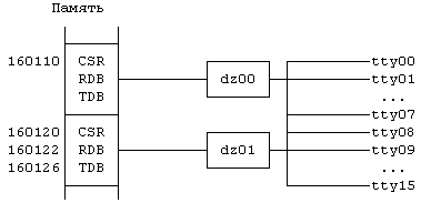 Рисунок 10.5. Отображение в памяти ввода-вывода с использованием контроллера VAX DZ11 Конкретный метод взаимодействия драйвера с устройством определяется особенностями аппаратуры. Некоторые из машин обеспечивают отображение ввода-вывода в памяти, подразумевающее, что конкретные адреса в адресном пространстве ядра являются не номерами ячеек в физической памяти, а специальными регистрами, контролирующими соответствующие устройства. Записывая в указанные регистры управляющие параметры в соответствии со спецификациями аппаратных средств, драйвер осуществляет управление устройством. Например, контроллер ввода-вывода для машины VAX-11 содержит специальные регистры для записи информации о состоянии устройства (регистры контроля и состояния) и для передачи данных (буферные регистры), которые формируются по специальным адресам в физической памяти. В частности, терминальный контроллер VAX DZ11 управляет 8 асинхронными линиями терминальной связи (см. [Levy 80], где более подробно объясняется архитектура машин VAX). Пусть регистр контроля и состояния (CSR) для конкретного терминала DZ11 имеет адрес 160120, передающий буферный регистр (TDB) - адрес 120126, а принимающий буферный регистр (RDB) - адрес 160122 (Рисунок 10.5). Для того, чтобы передать символ на терминал "/dev/tty09", драйвер терминала записывает единицу (1 = 9 по модулю 8) в указанный двоичный разряд регистра контроля и состояния и затем записывает символ в передающий буферный регистр. Запись в передающий буферный регистр является передачей данных. Контроллер DZ11 выставляет бит "выполнено" в регистре контроля и состояния, когда готов принять следующую порцию данных. Дополнительно драйвер может выставить бит "возможно прерывание передачи" в регистре контроля и состояния, что заставляет контроллер DZ11 прерывать работу системы, когда он готов принять следующую порцию данных. Чтение данных из DZ11 производится аналогично. На других машинах имеется программируемый ввод-вывод, подразумевающий, что в машине имеются инструкции по управлению устройствами. Драйверы управляют устройствами, выполняя соответствующие инструкции. Например, в машине IBM 370 имеется инструкция "Start I/O" (Начать ввод-вывод), которая инициирует операцию ввода-вывода, связанную с устройством. Способ связи драйвера с периферийными устройствами незаметен для пользователя. Поскольку интерфейс между драйверами устройств и соответствующими аппаратными средствами является машинно-зависимым, на этом уровне не существует стандартных интерфейсов. Как в случае вводавывода с отображением в памяти, так и в случае программируемого ввода-вывода драйвер может посылать на устройство управляющие последовательности с целью установления режима прямого доступа в память (ПДП) для устройства. Система позволяет осуществлять массовую передачу данных между устройством и памятью в режиме ПДП параллельно с работой центрального процессора, при этом устройство прерывает работу системы по завершении передачи данных. Драйвер организует управление виртуальной памятью таким образом, чтобы ячейки памяти с их действительными номерами использовались для ПДП. Быстродействующие устройства могут иногда передавать данные непосредственно в адресное пространство задачи, без вмешательства буфера ядра. В результате повышается скорость передачи данных, поскольку при это