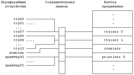 Рисунок 10.6. Прерывания от устройств 10.1.3 Программы обработки прерыванийКак уже говорилось выше (раздел 6.4.1), возникновение прерывания побуждает ядро запускать программу обработки прерываний, в основе алгоритма которой лежит соотношение между устройством, вызвавшим прерывание, и смещением в таблице векторов прерываний. Ядро запускает программу обработки прерываний для данного типа устройства, передавая ей номер устройства или другие параметры для того, чтобы идентифицировать единицу устройства, вызвавшую прерывание. Например, в таблице векторов прерываний на Рисунке 10.6 показаны две точки входа для обработки прерываний от терминалов ("ttyintr"), каждая из которых используется для обработки прерываний, поступивших от 8 терминалов. Если устройство tty09 прервало работу системы, система вызывает программу обработки прерывания, ассоциированную с местом аппаратного подключения устройства. Поскольку с одной записью в таблице векторов прерываний может быть связано множество физических устройств, драйвер должен уметь распознавать устройство, вызвавшее прерывание. На рисунке записи в таблице векторов прерываний, соответствующие прерываниям от терминалов, имеют метки 0 и 1, чтобы система различала их между собой при вызове программы обработки прерываний, используя к примеру этот номер в качестве передаваемого программе параметра. Программа обработки прерываний использует этот номер и другую информацию, переданную механизмом прерывания, для того, чтобы удостовериться, что именно устройство tty09, а не tty12, прервало работу системы. Этот пример в упрощенном виде показывает то, что имеет место в реальных системах, где на самом деле существует несколько уровней контроллеров и соответствующих программ обработки прерываний, но он иллюстрирует общие принципы. Если подвести итог, можно сказать, что номер устройства, используемый программой обработки прерываний, идентифицирует единицу аппаратуры, а младший номер в файле устройства идентифицирует устройство для ядра. Драйвер устройства устанавливает соответствие между младшим номером устройства и номером единицы аппаратуры. (*) И наоборот, системная функция fcntl обеспечивает контроль над действиями, производимыми на уровне дескриптора файла, но не на уровне устройства. В других реализациях функция ioctl применима для файлов всех типов. (**) На практике вывод на печать обычно управляется специальными процессами буферизации, и права доступа устанавливаются таким образом, чтобы только система буферизации могла обращаться к принтеру.