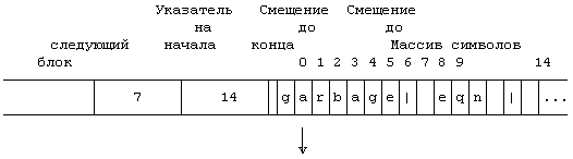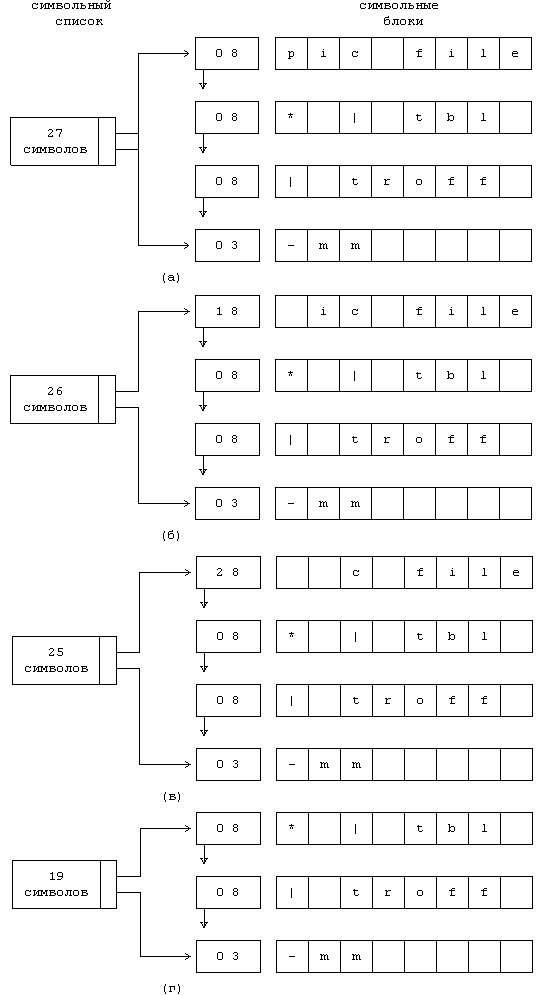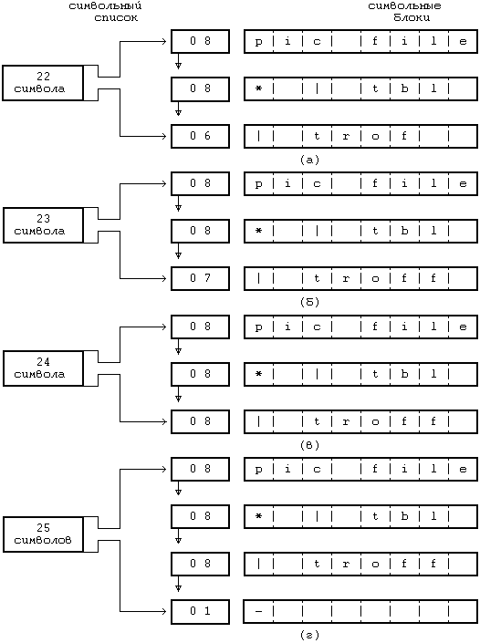 Рисунок 10.10. Символьный блок Ядро обеспечивает ведение списка свободных символьных блоков и выполняет над символьными списками и символьными блоками шесть операций.
