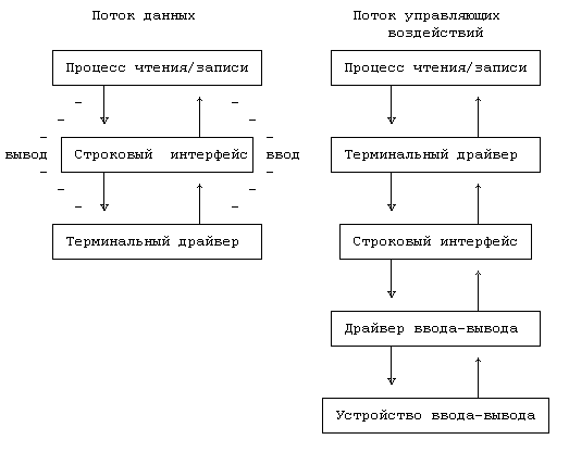 Структуры данных, с которыми работают терминальные драйверы, связаны с тремя символьными списками: списком для хранения данных, выводимых на терминал, списком для хранения неструктурированных вводных данных, поступивших в результате выполнения программы обработки прерывания от терминала, вызванного попыткой пользователя ввести данные с клавиатуры, и списком для хранения обработанных входных данных, поступивших в результате преобразования строковым интерфейсом специальных символов (таких как символы стирания и удаления) в неструктурированном списке.