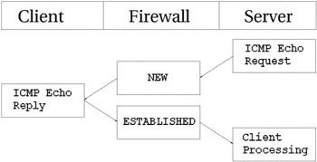 Как видно из этого рисунка, сервер выполняет Echo Request (эхо-запрос) к клиенту, который (запрос) распознается брандмауэром как NEW. На этот запрос клиент отвечает пакетом Echo Reply, и теперь пакет распознается как имеющий состояние ESTABLISHED. После прохождения первого пакета (Echo Request) в ip_conntrack появляется запись: icmp 1 25 src=192.168.1.6 Эта запись несколько отличается от записей, свойственных протоколам TCP и UDP, хотя точно так же присутствуют и название протокола и время таймаута и адреса передатчика и приемника, но далее появляются три новых поля - type, code и id. Поле type содержит тип ICMP, поле code - код ICMP. Значения типов и кодов ICMP приводятся в приложении Типы ICMP. И последнее поле id содержит идентификатор пакета. Каждый ICMP-пакет имеет свой идентификатор. Когда приемник, в ответ на ICMP-запрос посылает ответ, он подставляет в пакет ответа этот идентификатор, благодаря чему, передатчик может корректно распознать в ответ на какой запрос пришел ответ. Следующее поле -- флаг [UNREPLIED], который встречался нам ранее. Он означает, что прибыл первый пакет в соединении. Завершается запись характеристиками ожидаемого пакета ответа. Сюда включаются адреса отправителя и получателя. Что касается типа и кода ICMP пакета, то они соответствуют правильным значениям ожидаемого пакета ICMP Echo Reply. Идентификатор пакета-ответа тот же, что и в пакете запроса. Пакет ответа распознается уже как ESTABLISHED. Однако, мы знаем, что после передачи пакета ответа, через это соединение уже ничего не ожидается, поэтому после прохождения ответа через netfilter, запись в таблице трассировщика уничтожается. В любом случае запрос рассматривается как NEW, а ответ как ESTABLISHED.
