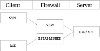 Эти четыре состояния могут использоваться в критерии --state. Механизм определения состояния позволяет строить чрезвычайно мощную и эффективную защиту. Раньше приходилось открывать все порты выше 1024, чтобы пропустить обратный трафик в локальную сеть, теперь же, при наличии механизма определения состояния, необходимость в этом отпала, поскольку появилась возможность "открывать" доступ только для обратного (ответного) трафика, пресекая попытки установления соединений извне. 4.4. TCP соединенияВ этом и в последующих разделах мы поближе рассмотрим признаки состояний и порядок их обработки каждым из трех базовых протоколов TCP, UDP и ICMP, а так же коснемся случая, когда протокол соединения не может быть классифицирован на принадлежность к трем, вышеуказанным, протоколам. Начнем рассмотрение с протокола TCP, поскольку он имеет множество интереснейших особенностей в отношении механизма определения состояния в iptables. TCP соединение всегда устанавливается передачей трех пакетов, которые инициализируют и устанавливают соединение, через которое в дальнейшем будут передаваться данные. Сессия начинается с передачи SYN пакета, в ответ на который передается SYN/ACK пакет и подтверждает установление соединения пакет ACK. После этого соединение считается установленным и готовым к передаче данных. Может возникнуть вопрос: "А как же трассируется соединение?". В действительности все довольно просто. Для всех типов соединений, трассировка проходит практически одинаково. Взгляните на рисунок ниже, где показаны все стадии установления соединения. Как видите, трассировщик, с точки зрения пользователя, фактически не следит за ходом установления соединения. Просто, как только трассировщик "увидел" первый (SYN) пакет, то присваивает ему статус NEW. Как только через трассировщика проходит второй пакет (SYN/ACK), то соединению присваивается статус ESTABLISHED. Почму именно второй пакет? Сейчас разберемся. Строя свой набор правил, вы можете позволить покидать локальную сеть пакетам со статусом NEW и ESTABLISHED, а во входящем трафике пропускать пакеты только со статусом ESTABLISHED и все будет работать прекрасно. И наоборот, если бы трассировщик продолжал считать соединение как NEW, то фактически вам никогда не удалось бы установить соединение с "внешним миром", либо пришлось бы позволить прохождение NEW пакетов в локальную сеть. С точки зрения ядра все выглядит более сложным, поскольку в пространстве ядра TCP соединения имеют ряд промежуточных состояний, недоступных в пространстве пользователя. В общих чертах они соответствуют спецификации RFC 793 - Transmission Control Protocol на странице 21-23. Более подробно эта тема будет рассматриваться чуть ниже.