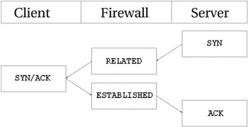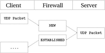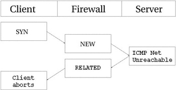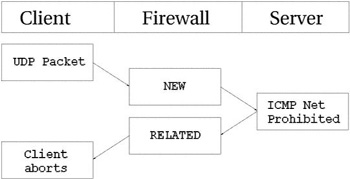 В этом примере некоторому узлу передается запрос на соединение (SYN пакет). Он приобретает статус NEW на брандмауэре. Однако, в этот момент времени, сеть оказывается недоступной, поэтому роутер возвращает пакет ICMP Network Unreachable. Трассировщик соединений распознает этот пакет как RELATED, благодаря уже имеющейся записи в таблице, так что пакет благополучно будет передан клиенту, который затем оборвет неудачное соединение. Тем временем, брандмауэр уничтожит запись в таблице, поскольку для данного соединения было получено сообщение об ошибке. То же самое происходит и с UDP соединениями -- если обнаруживаются подобные проблемы. Все сообщения ICMP, передаваемые в ответ на UDP соединение, рассматриваются как RELATED. Взгляните на следующий рисунок.