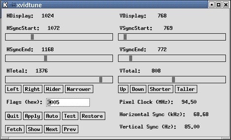 Рис. 7.3. Основное окно программы xvidtune Теперь вы можете начать настраивать изображение на мониторе. Если вы хотите сместить его вправо, то щелкните мышкой по кнопке Right (обратите внимание на изменение некоторых цифр в окне программы), а затем по кнопке Apply. Вы увидите, что изображение сдвинется вправо. Аналогично можно подвинуть его влево (кнопка Left), вверх (Up) и вниз (Down). Можно также увеличить размер изображения по горизонтали (Wider) или вертикали (Taller) и, наоборот, уменьшить (соответственно Narrower и Shorter). Запомните, что первоначальные установки можно всегда вернуть нажатием клавиши R или щелчком по кнопке Restore. Эта возможность особенно полезна в тех случаях, когда необходимо восстановить стабильный режим работы после слишком кардинальных изменений, когда изображение на экране пропадает вовсе или начинает мелькать. Кнопка Fetch служит для запроса текущих значений установок режима работы монитора. Кнопка Auto является переключателем, т. е. в режиме Auto (изображение кнопки инвертируется, т. е. отображается белыми буквами на черном фоне) нажатие на кнопки Up/Down/Right/Left и Wider/Narrower/Shorter/Taller приводит к немедленному (без щелчка по кнопке Apply) изменению размера или положения изображения. Кнопка Test временно переключает установки в указанные значения. Кнопка Show служит для того, чтобы вывести выбранные значения на стандартный вывод (практически — в окно эмулятора терминала, из которого была запущена программа). Строка выводится в формате "Modeline", т. е. в том виде, как она должна быть записана в файле XF86Config. Кнопка Next переключает X-сервер в следующий видеорежим, а кнопка Prev — в предыдущий видеорежим (как они заданы в строке "Modes"). После того, как вы подобрали оптимальные с вашей точки зрения значения параметров видеорежима, запишите эти значения на бумагу. Не забудьте записать и приведенные в правом нижнем углу значения частот вертикальной и горизонтальной синхронизации. Формально они не нужны, но обычно пишутся в комментарии к строке "Modeline". На всякий случай нажмите кнопку Show и завершите работу программы нажатием кнопки Quit. После этого осталось проверить, правильно ли вы записали значения и вписать новую строку "Modeline" в файл XF86Config. Теперь еще обратите внимание на то, что как бы мы не изменяли положение изображения, остается неизменным значение Pixel Clock в правом нижнем углу окна программы xvidtune. Этот параметр не поддается изменению в рамках программы xvidtune. Но после того, как выбраны размеры и положение изображения на экране, можно и нужно рассчитать наилучшее значение этого параметра. Принцип расчета прост: берем максимально допустимое для вашего монитора значение частоты горизонтальной синхронизации и делим его на размер фрейма по горизонтали (это последнее число в группе HTimings), выданное программой xvidtune. Это предельно допустимое значение частоты DotClock, которое может быть задано в строке "Modeline". Для перестраховки я немного округляю это значение в сторону уменьшения, чтобы не превысить максимальное значение частоты горизонтальной синхронизации. На этом формирование строки "Modeline" можно считать завершенным. Аналогично можно подобрать значения для других таких строк (для других разрешений), но, честно признаюсь, что мне эксперименты по изменению видеорежимов через некоторое время наскучили. Я выбрал для себя один режим работы дисплея и успокоился. Думаю, что так же 