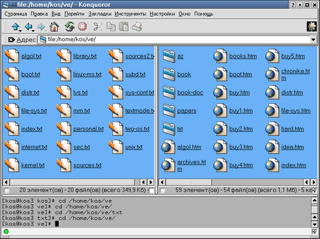 Рис. 15.14. Окно файлового менеджера Konqueror с двумя панелями и "командной строкой" Как видите, есть даже командная строка. Правда, мне лично не хватает привычных кнопок, ассоциированных с клавишами <F1> — <F10> и некоторых других элементов интерфейса, так что я в большинстве случаев предпочитаю пользоваться "настоящим" Midnight Commander. Но в чем Konqueror превосходит Midnight Commander, так это в средствах просмотра файлов. И для этих целей я использую именно Konqueror. В нем в большинство файлов можно "заглянуть" так же удобно, как и в любой каталог. Это касается не только текстовых или html-файлов, но и, например, графических файлов разных форматов. В общем, Konqueror, безусловно, является одним из элементов удобной пользовательской среды, а уж в каких случаях им пользоваться — дело вкуса и привычек (или наличия необходимых знаний и соответствующей степени знакомства с продуктом). Из дополнительно устанавливаемых утилит в первую очередь надо упомянуть архиватор bzip2 (если он не установлен). Его необходимо установить, поскольку архивы в этом формате нередко будут встречаться вам в Интернете. В составе KDE имеется довольно удобная утилита Архиватор (ark), которая умеет работать с разными типами архивных файлов. Она позволяет просматривать архивы разных форматов (tar, tar.gz, tar.bz2, zip, rar, zoo, lzh, a), а также создавать новые архивы. О некоторых программах, которые в главном меню KDE первоначально отнесены к группе утилит, я еще напомню вам в следующих разделах. А здесь, в завершение раздела об утилитах хочу сказать пару слов о двух средствах, необходимых на мой взгляд для любого компьютера при любой операционной системе. Это источник бесперебойного питания с соответствующим программным обеспечением и антивирусный пакет. В разделе о файловой системе уже было сказано, что выключать компьютер с Linux простым отключением питания недопустимо: это может привести к непоправимым сбоям в файловой системе. Но ведь отключение питания может произойти и не по вашей воле. Поэтому очень желательно приобрести и установить источник бесперебойного питания, а также найти, инсталлировать и настроить программные средства для выключения системы по сигналу о выключении питания. К сожалению, я не могу дать здесь более подробные рекомендации, но упомянуть об их существовании и необходимости посчитал полезным. Так же кратко упомяну и об антивирусных средствах. До недавнего времени считалось, что Linux не подвержен опасности заражения вирусами. Это даже преподносилось как одно из достоинств этой операционной системы. Однако в последнее время стало ясно, что это далеко не так. Впрочем, это и не удивительно, если вспомнить, что самый известный из вирусов, — червь Морриса, — был создан и распространялся именно в UNIX-сетях. Просто до некоторого времени авторы вирусов не уделяли внимания Linux из-за малой распространенности этой ОС и отсутствия у них необходимых знаний о ней. Так что антивирусные утилиты становятся необходимым компонентом программного обеспечения также и на компьютерах, работающих под Linux. К счастью, создатели антивирусного ПО тоже не дремлют. Как "Лаборатория Касперского" (www.kaspersky.ru), так и "Диалог-наука" (www.dials.ru) уже выпустили версии своих известных антивирусных программ AVP (или KAV) и DrWeb для Linux. К сожалению, эти продукты распространяются на коммерческой основе. Однако обе фирмы предоставляют всем желающ