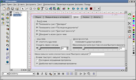 Рис. 15.15. Электронная таблица KSpread Когда говорят об "офисных приложениях", обычно имеют в виду не только работу с текстом, но и электронные таблицы, программу для построения схем, системы подготовки презентаций, а также и какую-либо из систем управления базами данных (хотя последнее уже необходимо далеко не всем). Здесь два основных конкурента в борьбе за место на вашем рабочем столе — пакеты OpenOffice.org и KOffice, хотя нельзя забывать и о программах проекта Gnome. Рис. 15.16. Система подготовки презентаций KPresenter (для просмотра щелкните по значку)