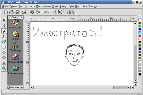Рис. 15.18. Рабочий стол Koffice с запущенной программой KIllustrator Я не могу утверждать, что эти приложения обеспечивают все возможности, которые имеются в пакете Microsoft Office, но пакет KOffice интенсивно развивается и совершенствуется, так что если не сейчас, то в ближайшем будущем будет удовлетворять потребности рядового пользователя. Его обновленные версии можно найти на сайте http://koffice.kde.org/. Что касается электронных таблиц, то, по отзывам в Интернете, очень неплохая электронная таблица для Linux разработана в рамках проекта Gnome. Называется она Gnumeric и найти ее можно по адресу ftp://ftp.gnome.ru/gnumeric/. Возможности этой программы (по крайней мере по той информации, которая опубликована на сайте http://www.gnome.ru), впечатляют. Она поддерживает 95% встроенных функций Excel и 100% инженерных функций, внутри-табличные зависимости, все встроенные в Excel форматы представления данных (числовой, денежный, учетный, даты, времени, процентов, дробный, научный, текстовый, специальный) и многое другое. В составе Gnumeric имеются фильтры для импорта файлов в форматах: